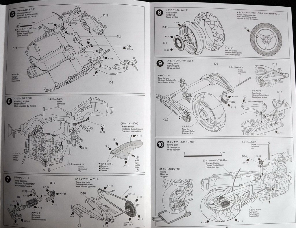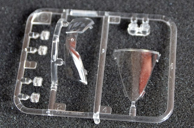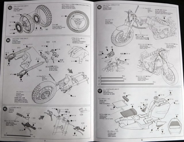 В коробке 6 литников в целлофановых пакетах, отдельно в целлофане запаяны 2 колеса, 2 шланга разного диаметра, крепеж, пружина и отвертка. Литники с деталями выполнены качественно, следы от толкателей с внутренней стороны деталей, литники сделаны из серо-металлического пластика, кроме элементов двигателя, радиатора, крепления фар и сидения. Литники с элементами рамы, фар и передней вилки колеса покрыты заводским матовым хромом. В комплекте идут декали в количестве 21 шт. и голографическая пленка для лобового стекла.
