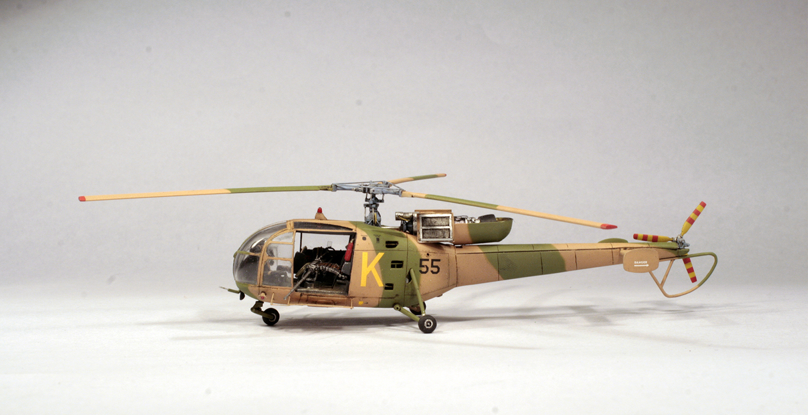 Сборка, по сути, представляла из себя конверсию гражданской версии в военную. Так что пришлось не только дополнять убогую деталировку, но и самоделить много деталей. Добавил ремни, щиток на приборку и прочую мелочь в кабину, пушку и тд. Перешил расшивку. На двигатель добавил проводку, противопыльные фильтры, "корыто"-экран от ракет с тепловым наведением и тд. Доработал и винт с автоматом перекоса. Самодельные подножки, БАНо. Дверь пилота сделал открывающейся. Высверлил отверстия в двигательном отсеке.
