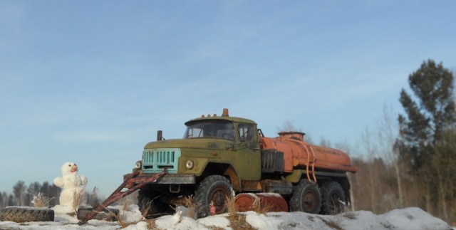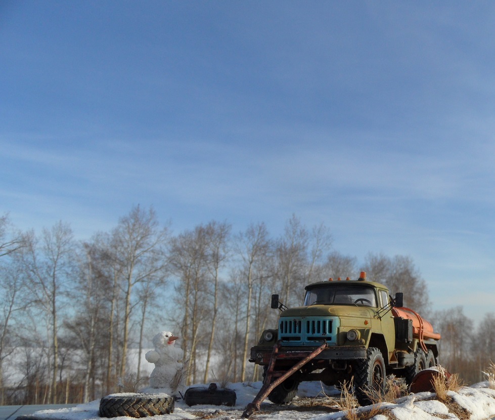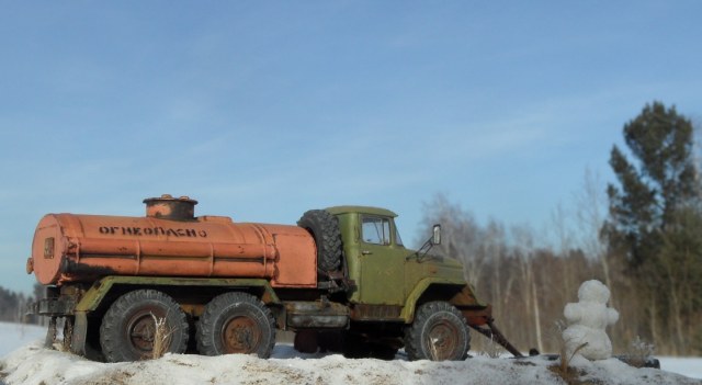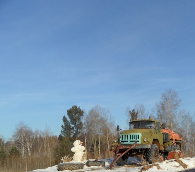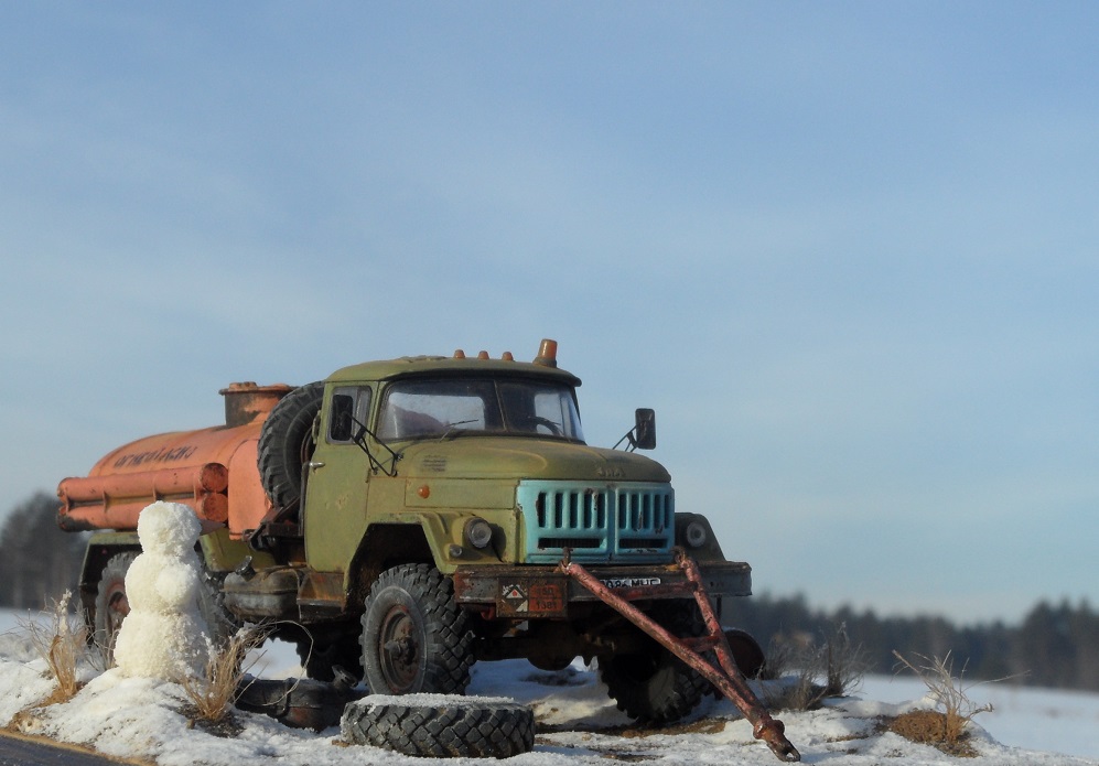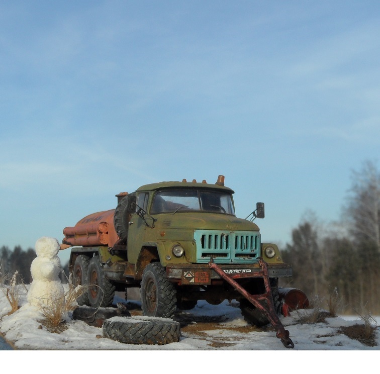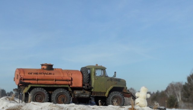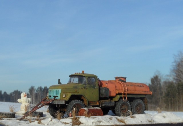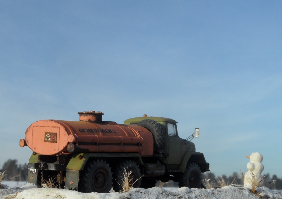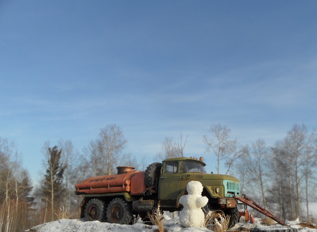Отличный ЗиЛ и отличный снег! Но, в череде дифирамбов можно и покритиковать чуточку: почему на машине снега нет совсем? На бочке рядом снег есть, и снеговик выглядит совсем не подтаявшим - как будто его свежим снежком присыпало. В общем: на ЗиЛе снега не хватает, хотя бы талые остатки в уголках подножек, у лобового стекла и на бампере. В остальном гармония