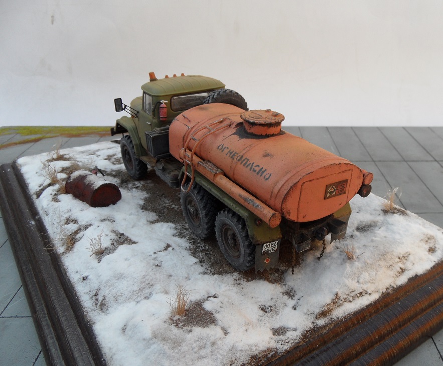 Привет всем! Доделал очередную новинку от Авто в деталях- на этот раз это бензовоз на базе Зил 131. Набор стандартен, имеет металлическую кабину, остальное пластик, травленые дворники . Мне модель понравилась, легкая в сборке как и все AVD , грамотное членение бочки позволяет обойтись без шпаклевки. От себя я добавил номера и зеркала от Петрограда, таблички , резина Харьковская, ручки на кабину, трубки на бензобаки, брызговики, подножку бампера и цепи антистатики. Окрашена модель автоэмалью мотип Хаки, тонирована сухая кисть и пигменты миг. Основание сода с пва, снеговик из пластики, жесткая сцепка из остатков литников, все сверху закреплено матовым лаком Босни. Приятного просмотра!