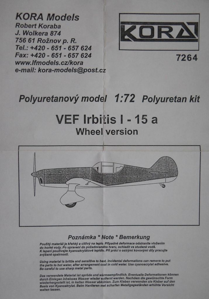 Модель из смолы от фирмы Kora в масштабе 1/72 (номер по каталогу 7264) упакована в небольшую картонную коробку с верхним открытием. В наборе даётся вариант I-15a с двигателем de Havilland ‘Gipsy Six-I” (185\200 л.с.) и двухлопастным деревянным винтом. Качество литья среднее, имеются незначительные дефекты. Фюзеляж выполнен одной деталью. Деталировка кабины минимальна. Приборная доска напечатана на бумаге. Декали прилагаются на один вариант. Ваку-фонарь смотрится удовлетворительно. Инструкция минимальна по содержанию, отсутствует информация по окраске интерьера.