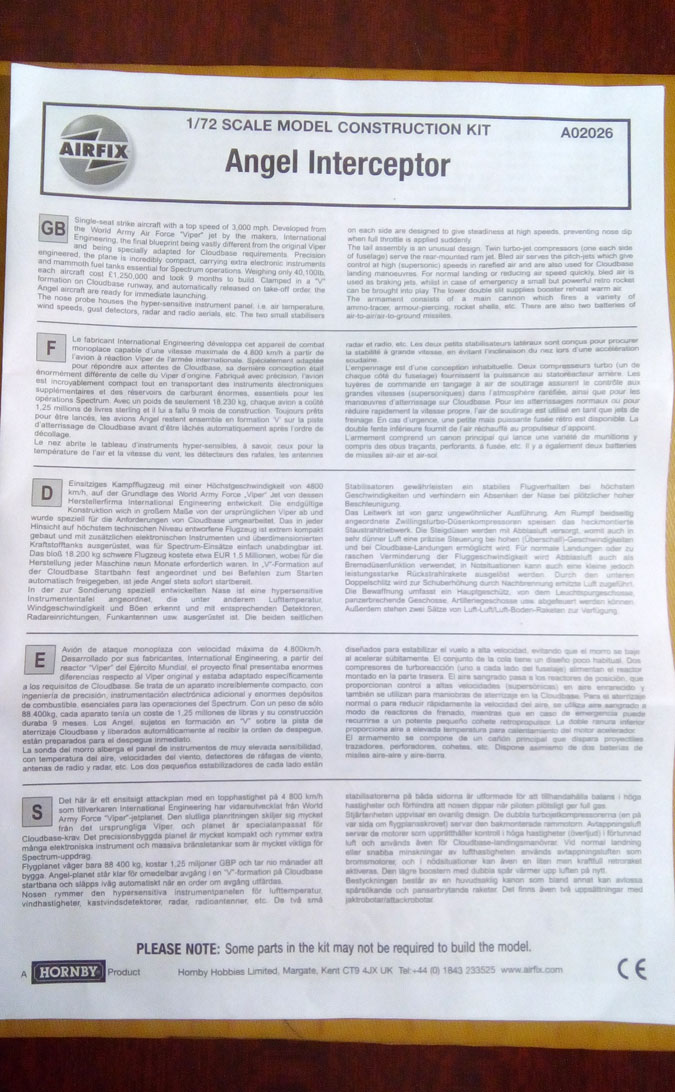 Коробка выполнена очень красочна, подстать новому дизайну всей упаковки Airfix. Внутри находится два пакета с литниками (фонарь и литники деталей выполненных в сером цвете). Всего литников 3 шт. Далее в боксе находится красочная инструкция, комплект декалей и анкета покупателя.