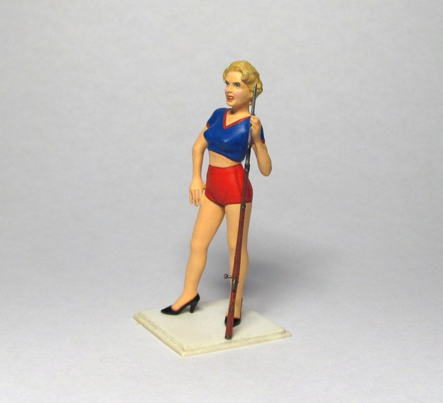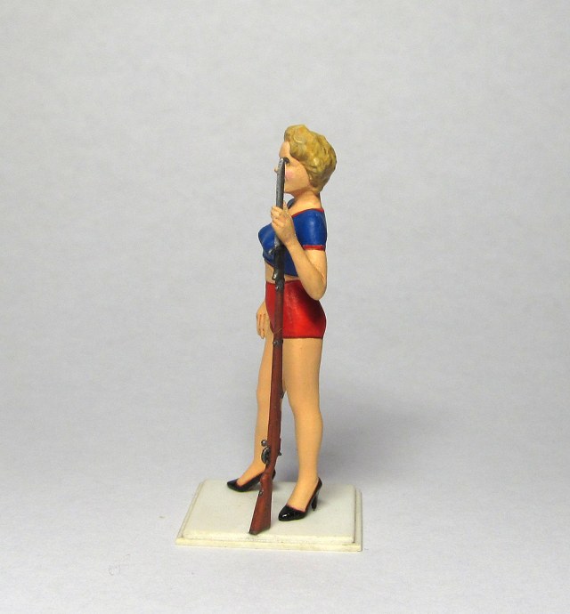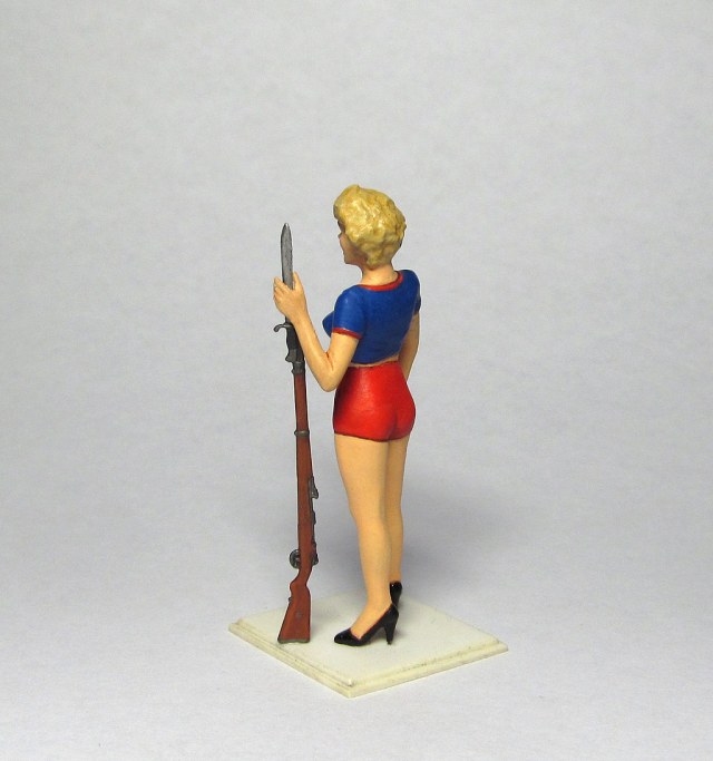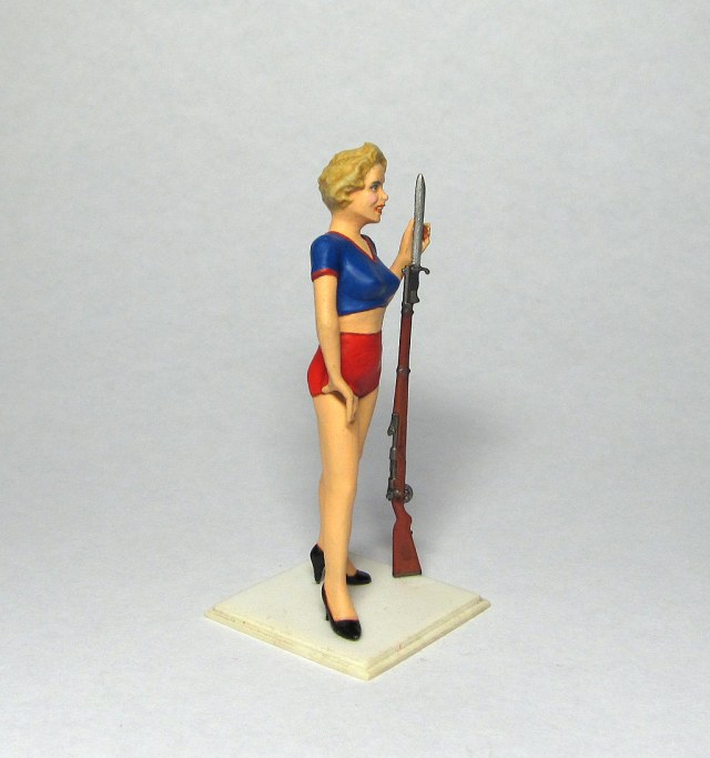 Смотрел я смотрел на эту подругу и решил, что она мне не нравится, надо перекрашивать. Радикально изменил цвета одежды и перекрасил кожу. Лицо трогать не стал- решил, что лучше не сделаю, а вот напортачить это запросто. Оружие тоже поменял, теперь у девушки длинный Маузер G98 из ICMовского набора немецкой пехоты WWI.