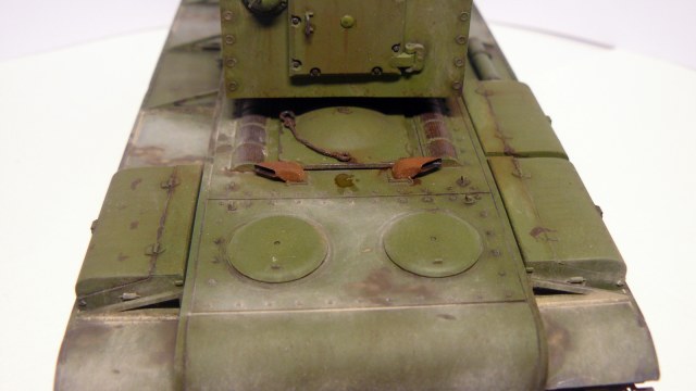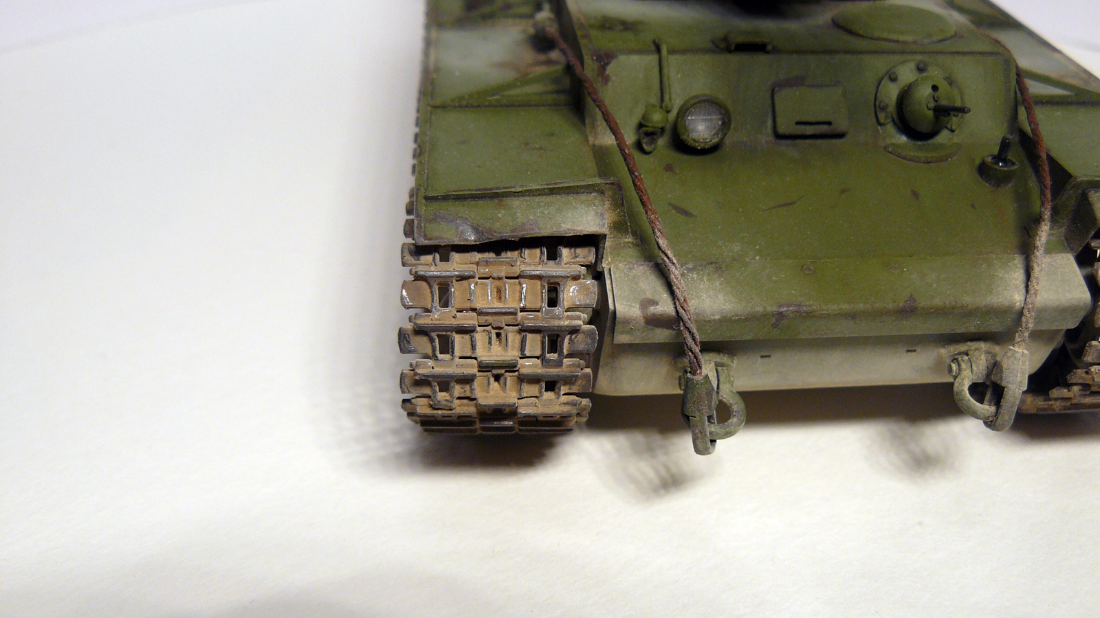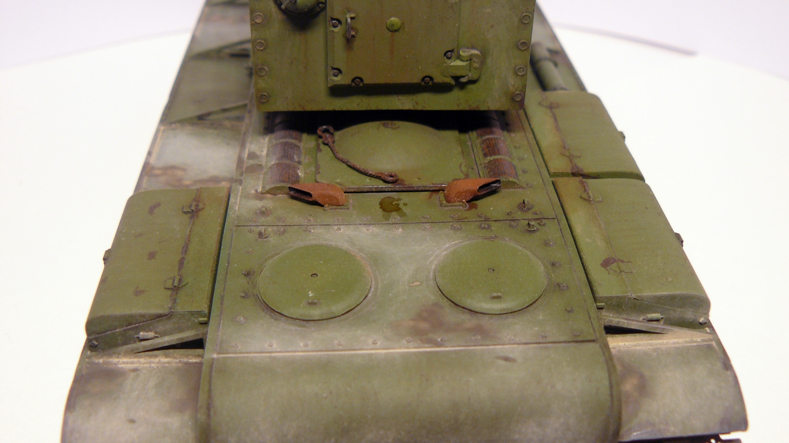 Спасибо всем за позитивные и не только отзывы! Про выхлоп думал долго и продолжаю размышлять, вроде как движок дизельный, то есть коптит страшно, но с другой стороны расстояние между выхлопными трубами и поверхностью достаточно большое, чтоб копоть не успела осесть. Пока еще в раздумьях добавить выхлоп или нет. Пыль наносил исходя из следующих соображений - танк находится в движении преимущественно по грунтовым дорогам. Экипаж танка выходил, залезал на танк в грязных, запыленных сапогах и естественно оставлял следы, больше следов на местах и поверхностях где больше наступала запыленная нога человека. Понятно, что чистый танк визуально смотрится лучше, но на мой взгляд во время марша это абсолютно не соответствует реалиям.