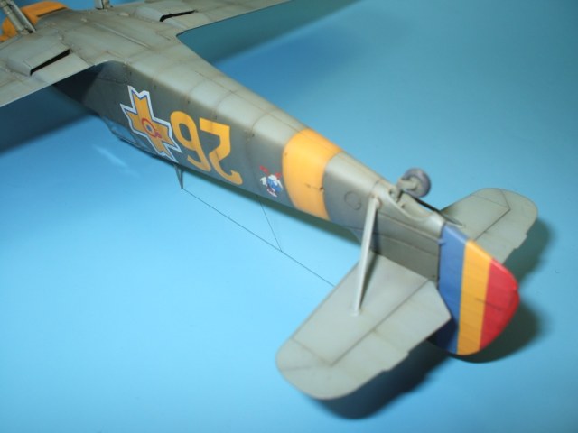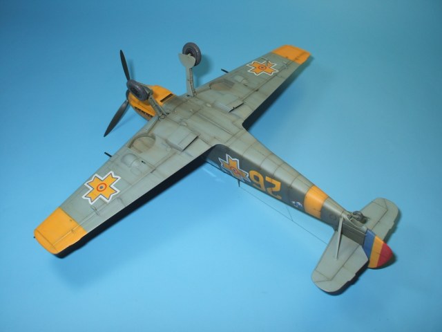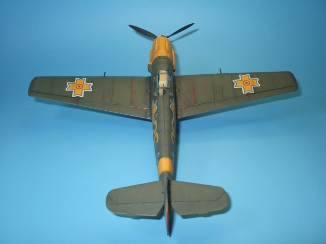 Модель собиралась на заказ в «изкоробочном» варианте, в связи счем доработки были сведены к минимуму. Хотя сам набор от одного из сильнейших производителей, деталировка откровенно слабая, на сегодняшний день это даже не уровень 72-го масштаба. Это обусловлено прежде всего тем, что набор давно не новинка, ему уже за двадцать, хотя качество литья и декаль(!) на соответствующем уровне .В связи со слабой деталировкой, при строительстве модели был применен фотоэтчет от фирмы Eduard, который несколько обогатил как интерьер так и экстерьер модели. И так по доработкам: в кабине проведена кое-какая проводка, сделана новая «марка» прицела, на стойках шасси имитирована магистраль гидросистемы, засверлены пулеметные и пушечные стволы, из тянутого прозрачного литника сделаны АНО, антенна - бантик. Красилась модель красками HobbyColor и Tamiya, также использовалась футура, смывка от MIG и масляные художественные краски. Особо хотел бы остановиться на декале. Заказчик модели интересуется ходом воздушных боевых действий на на южном участке фронта летом-осенью 1941года немцев и их сателлитов. В связи с чем, к модели была заказана декаль на Вf-109E румынских ВВС. Декаль от фирмы RBProductions прекрасного качества, - замечательная печать, правдоподобные цвета, хорошая реакция на соответствующую химию. Декаль отпечатана в Ирландии большим знатоком авиации Румынии, автором книг по истории авиации Румынии Раду Брынзан (RaduBrinzan)