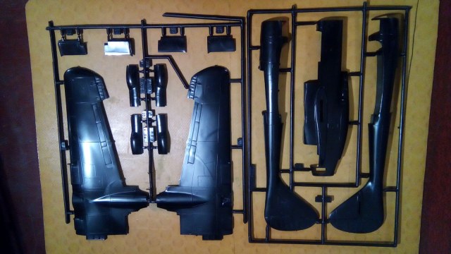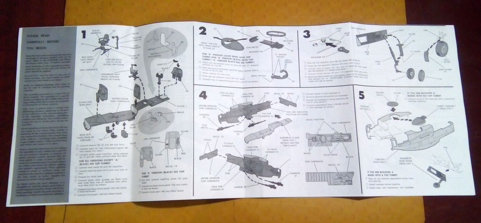 Коробка выполнена в картоне серых тонах с синим небом и черным самолетом. Внутри находится три пакетах с литниками (фонари и литники деталей, выполненных в черном цвете). Всего литников 7 шт., далее в боксе находится инструкция выполнена в серых тонах на большом листе, сложенном вдвое и декаль. В комплект также входит экипаж (или инженерный состав) самолета, состоящий из 3 человек, 1 сидящий и 2 стоящих.