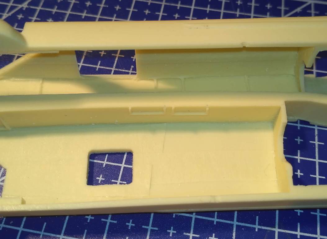 снаружи шов по фюзеляжу вроде без ступенек. зато внутри знатные ребра получаются. корпус очень незначительно поведен, придется участками склеивать. внутренние перегородки никакие - нужны новые.