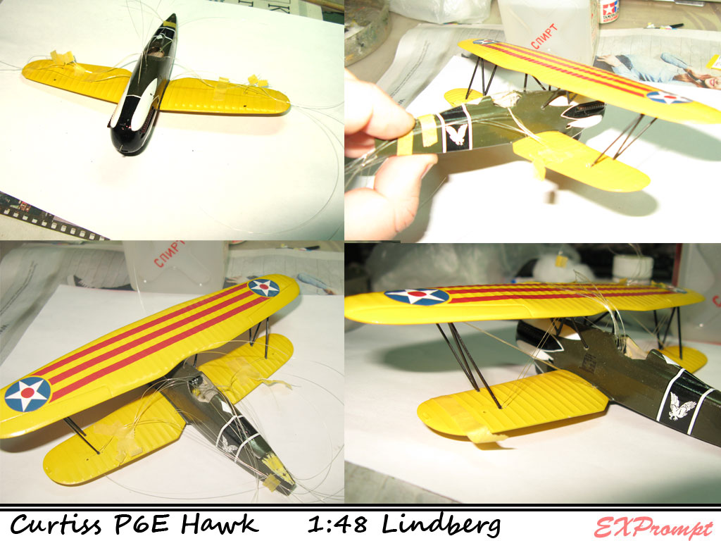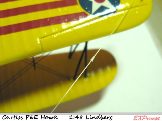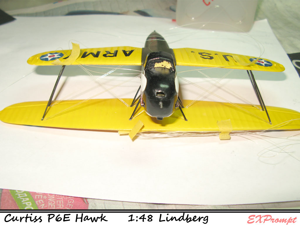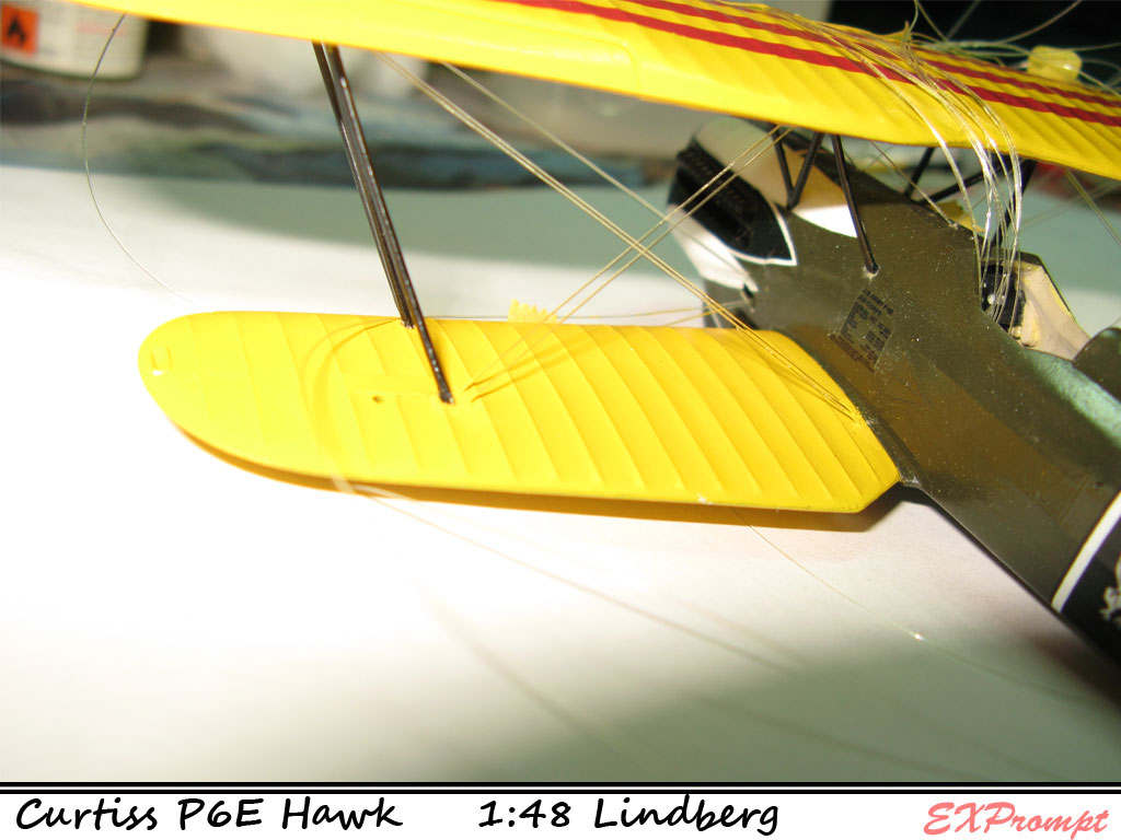 Подтягиваем из фюзеляжа леску хватаем временно на скотч, далее важно сгибаем леску в местах сопряжения с крыльями (верх крыло, ниж крыло) проводим по месту стыка деревяшкой итд итп... иначе при склеивании леску придется очень сильно пертягивать, а это нехорошо, так можно и бипланную коробку сломать или перекосить за счёт только натяга лески сильного.
