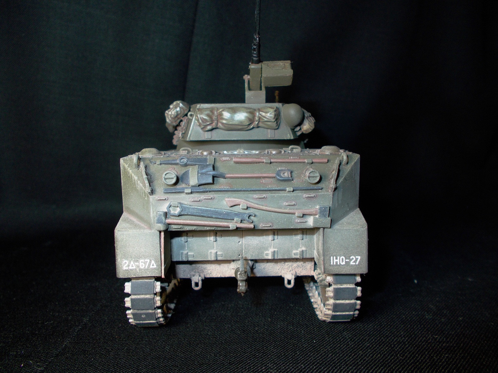 Сборка без особых доработок, добавил немного вещей на башню, переделал патронную коробку пулемета, обточил защиту фар.