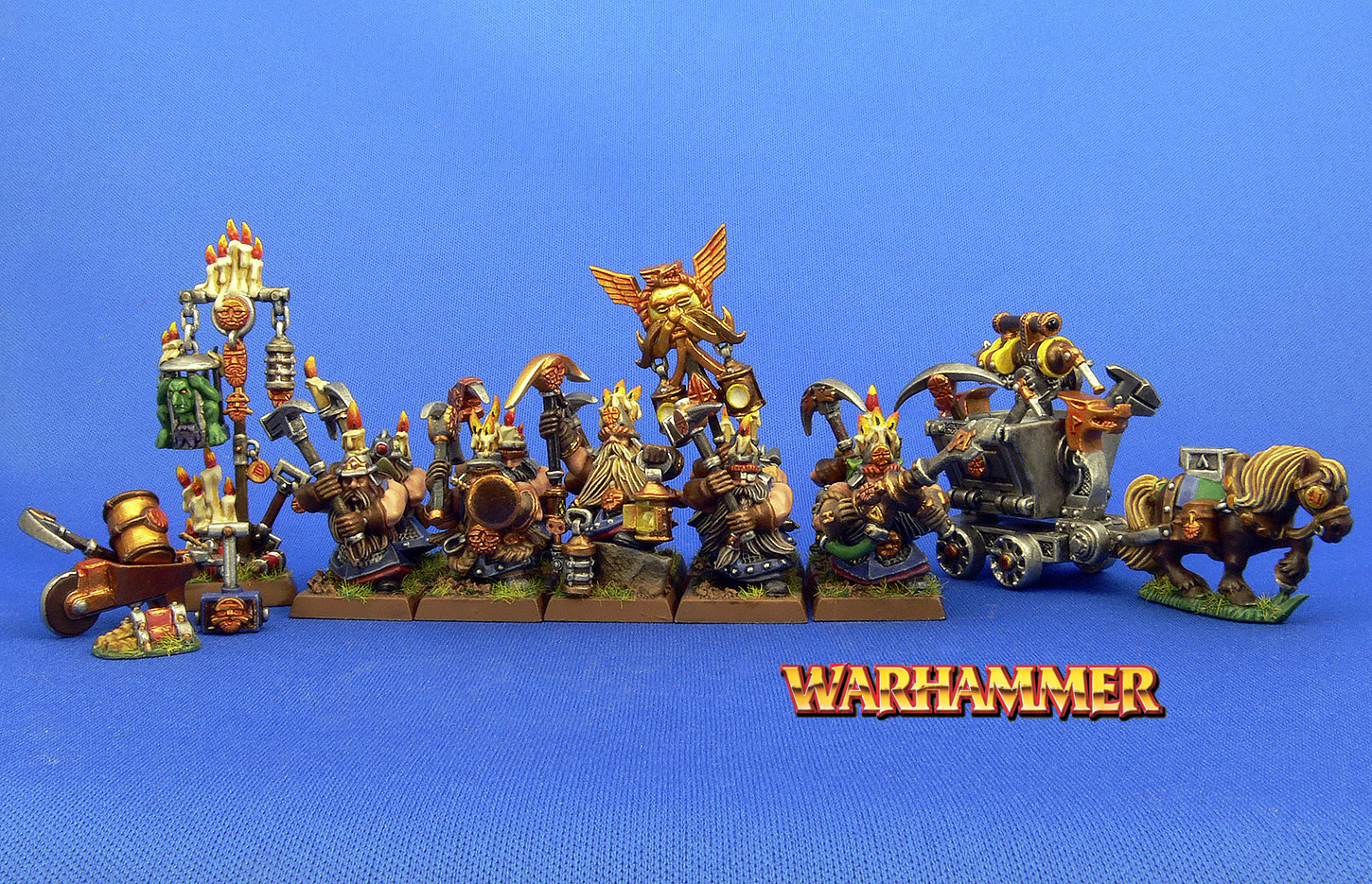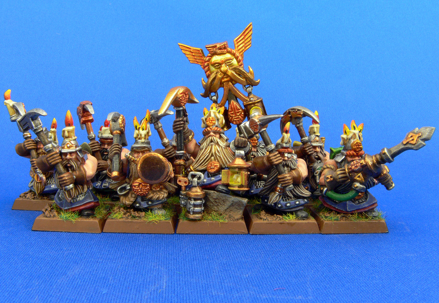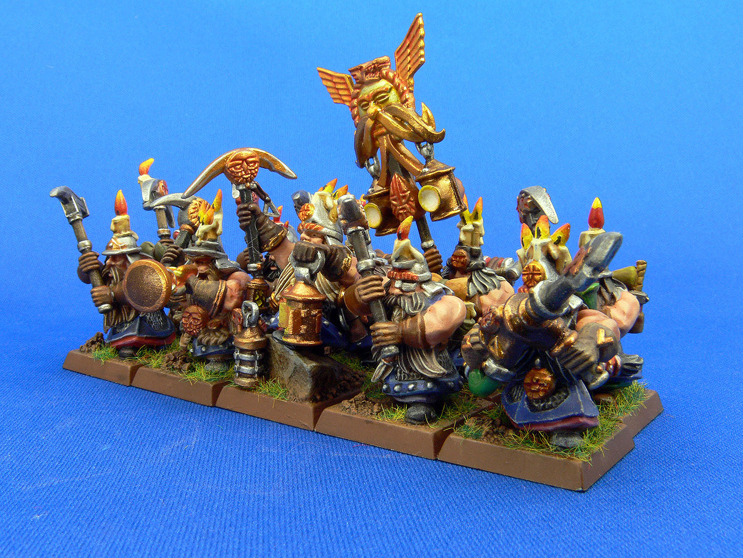 Такая типично гномья толпа с разными приспособлениями, кирками, идолами и прочим. Всё металлическое, как и положено.
