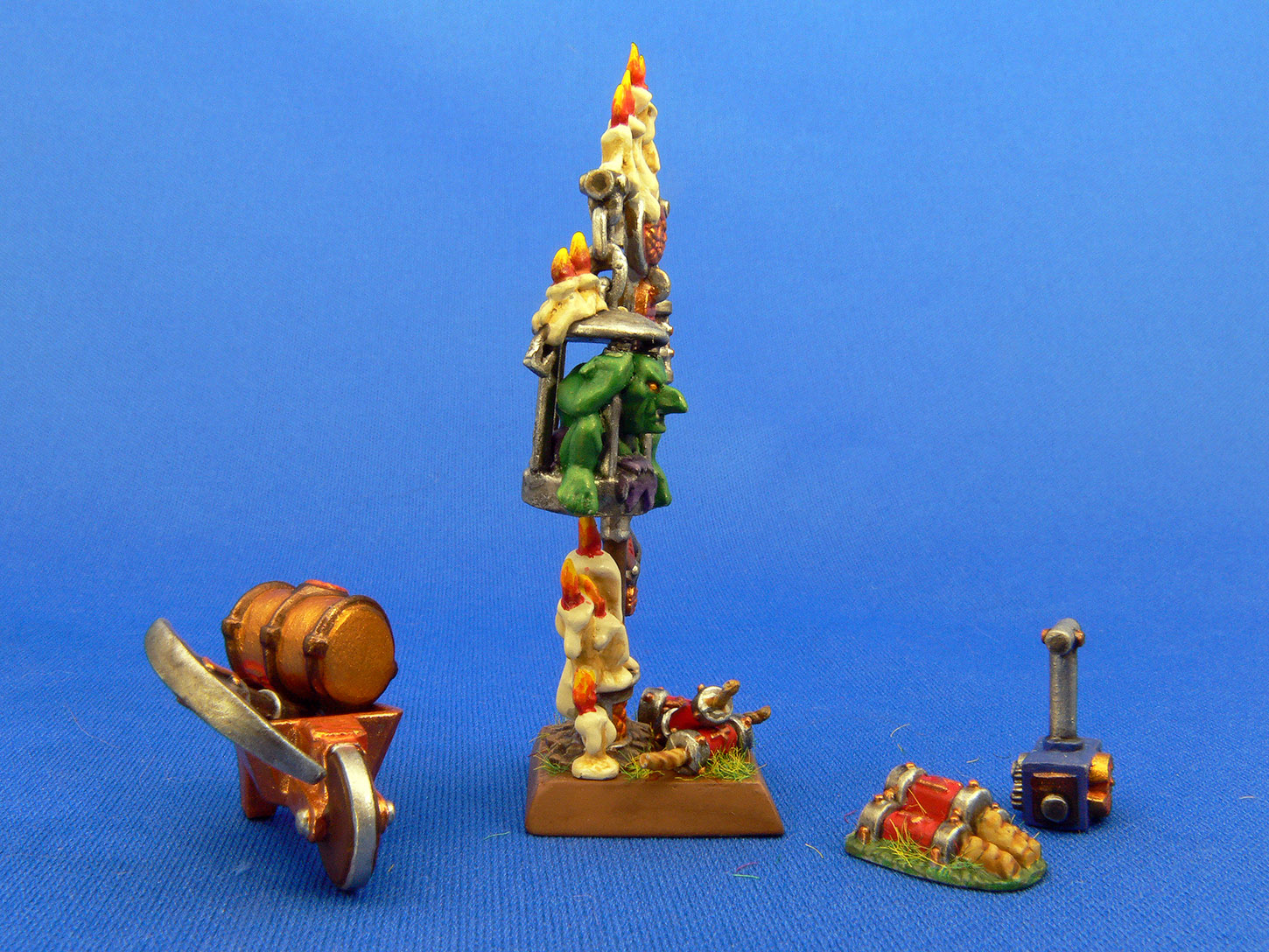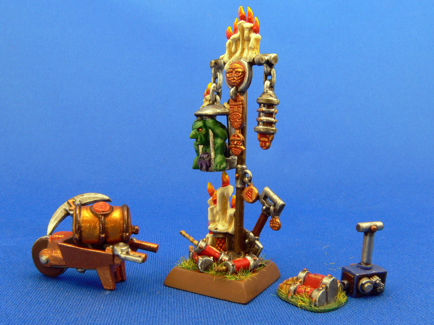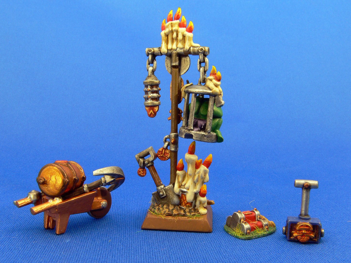 Такая типично гномья толпа с разными приспособлениями, кирками, идолами и прочим. Всё металлическое, как и положено.