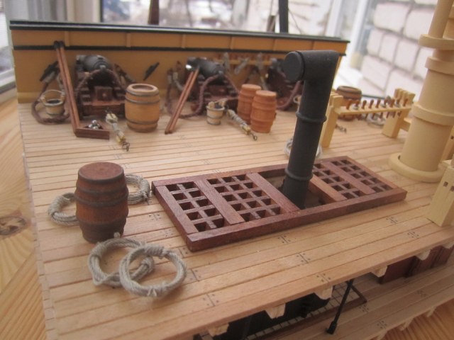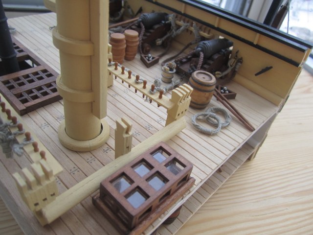 Грубые косяки: вант-путенсы производят впечатление канцелярских скрепок и пушки с портами абсолютно не бьют.Непонятна обмотка пушечных и откатных талей.Так обматывают только по походному,но положение пушек тогда другое.Настил пришивается по бимсу не только в местах стыков досок.Ставень на порт делается из двух половин-верхней и нижней....