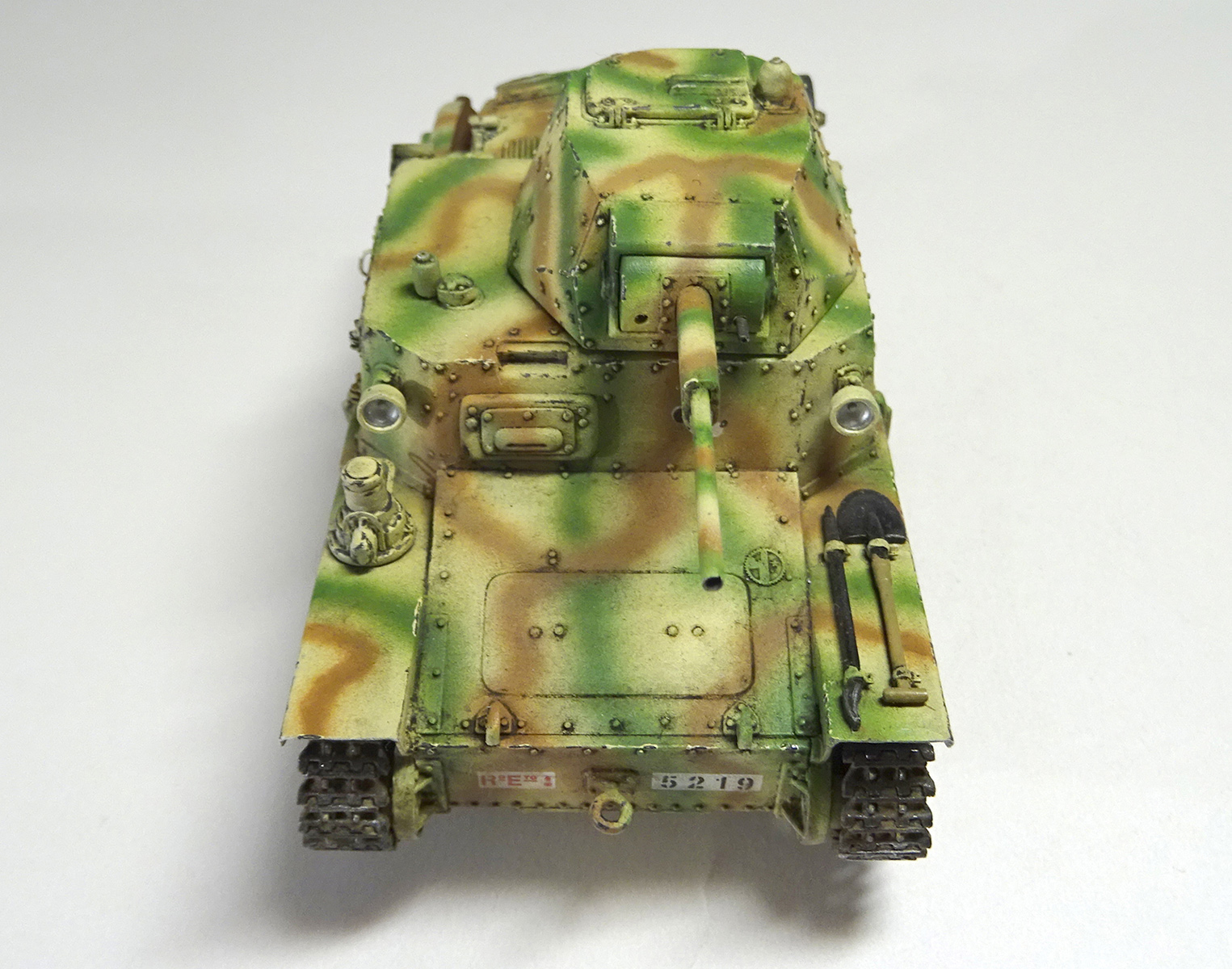 Окрашивал красками Валехо, АК и Ammo. Фильтры, темно коричневая смывка, всякие пигменты. Первый раз пробовал нанести тонкие линии камуфляжа аэрографом без масок, вроде получилось. Сколы сделал двухцветные, рисовал их кистью.