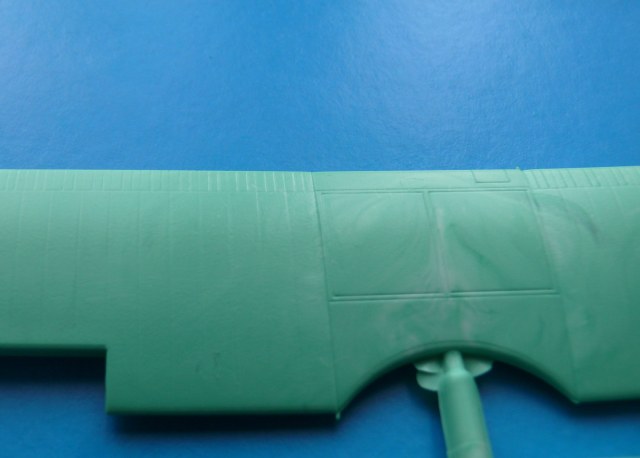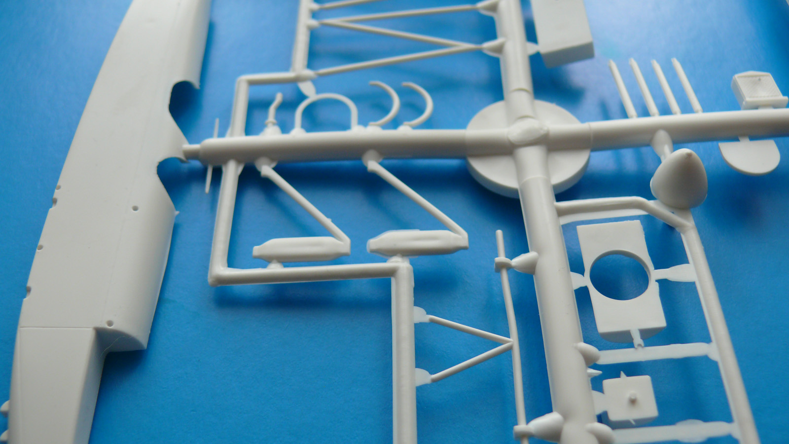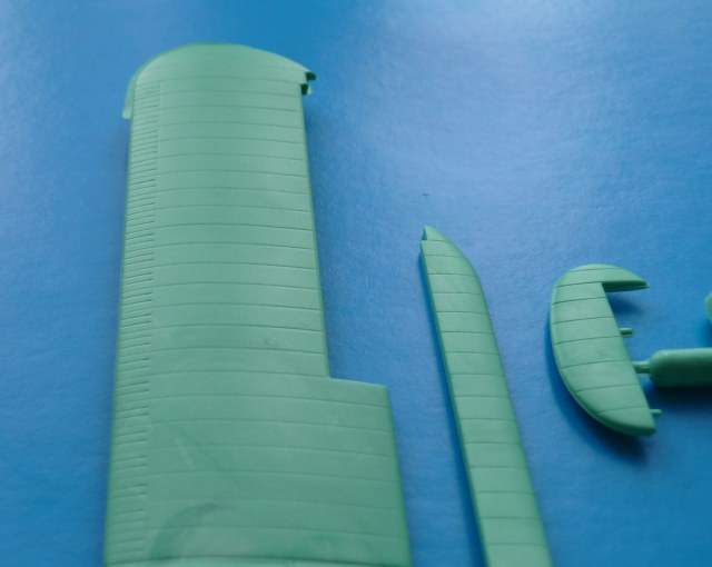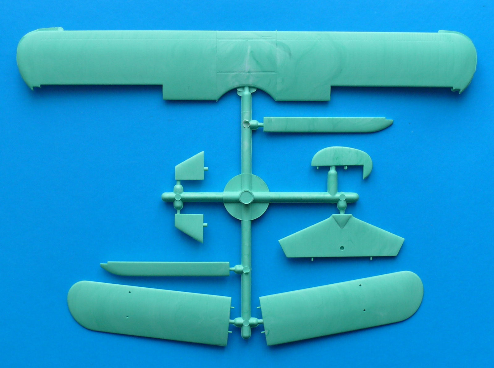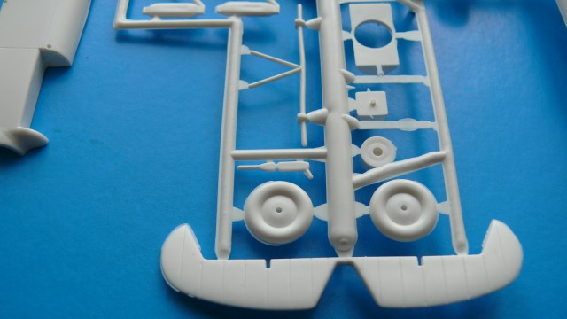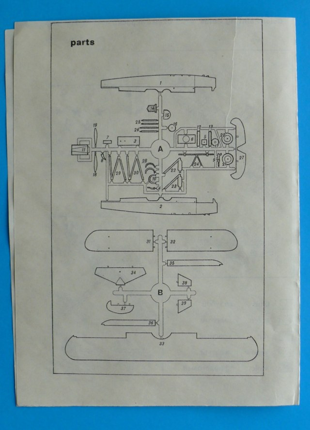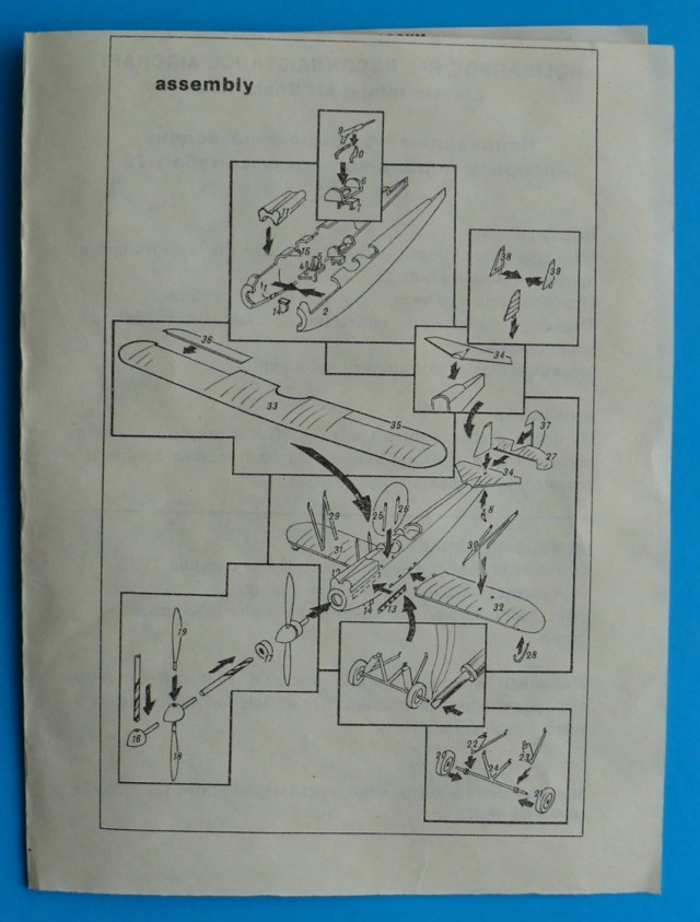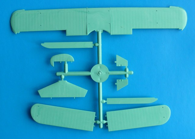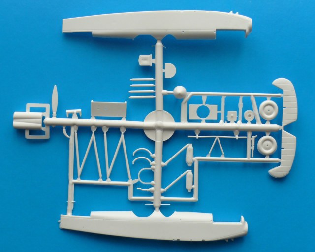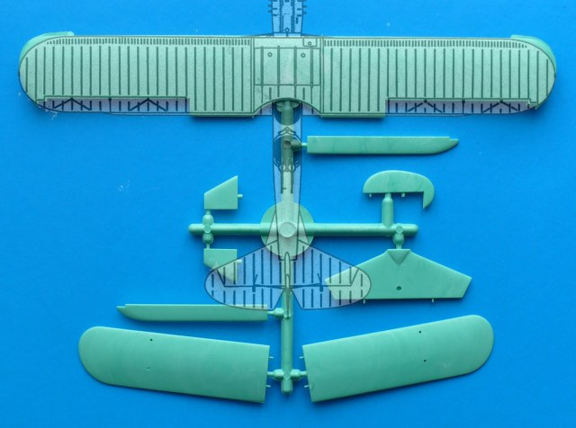 Модель находится в мягкой тонкой коробкес верхней загрузкой, качество печати плохое, картинка отпечатана со смещением. В наборе два литника из белого и зеленого пластика ЛВД и какой то кусочек прозрачной пленки, для самостоятельного вырезания козырьков кабины. Качество литья напоминает NOVOвские модели. Есть и облой и утяжины, немного смещены колеса шасси, однако крой внутренний тонкий, при чем даже ребра нервюр крыла и оперения для чего то выделены кроем. Деталировки никакой всю мелочевку скорее всего нужно переделывать. Но больше всего обидно что модель отличается от чертежей: форма капота двигателя, законцовки крыла, хвостовая часть фюзеляжа.