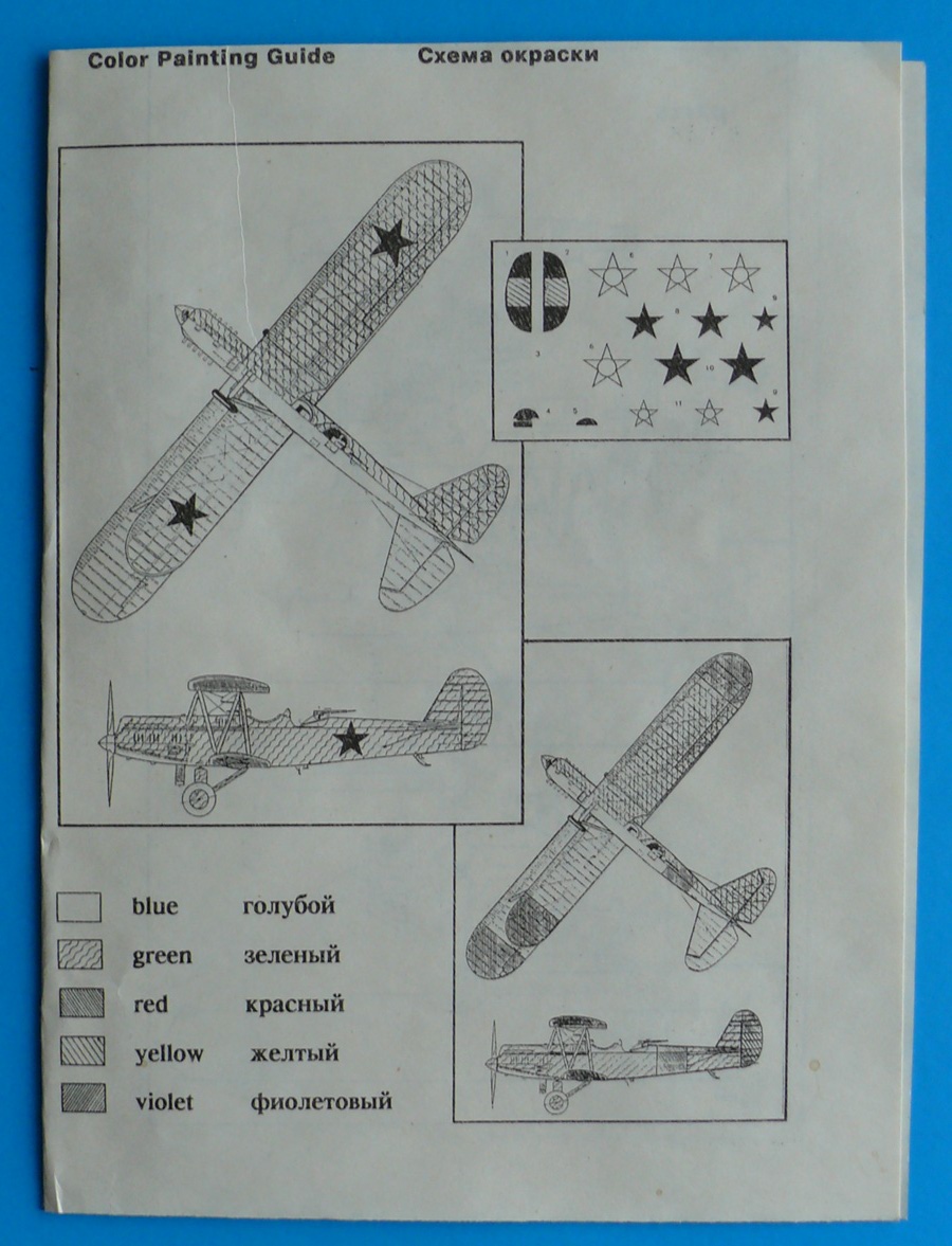 Инструкция черно-белая выполнена на листе А4 но для такого количества деталей вполне понятна и информативна. Схема окраски и декаль даны на два варианта, Советский и Испаннский. Декаль не очень качественная, со смещением, хотя порадовала неплохая приборная доска.