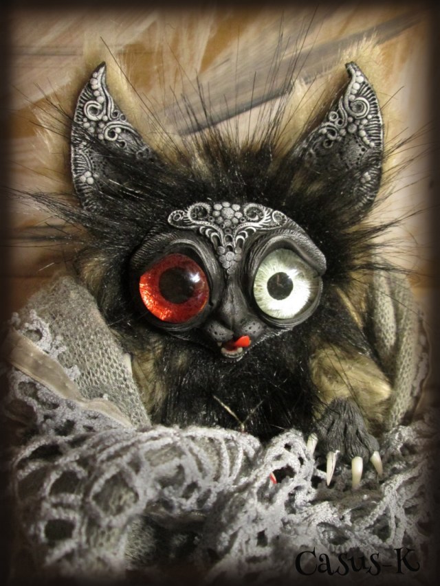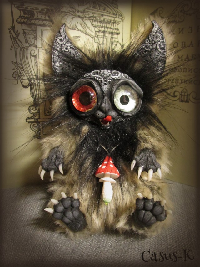 И ещё раз спасибо!!!Совершенно верно!По моему замыслу котёнок является персонажем из сказочного дремучего леса...Иногда он питается мухоморами,но вреда ему от оных грибов не случается, вот только глазки приобрели со временем характерную расцветку