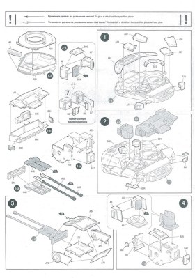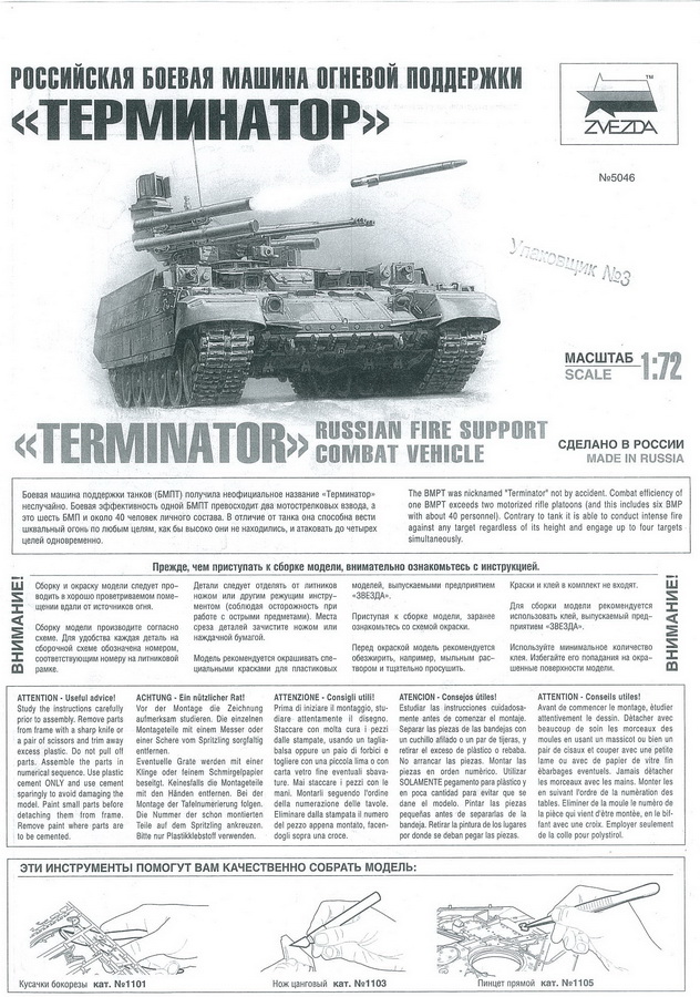 Внутри – ещё коробка, но уже с вертикальной загрузкой в которой находится запечатанный пакет с деталями для сборки модели, набора фототравления нет и инструкция формата А3, такая длинная портянка с изображениями, истории БМПТ, непосредственно самой сборки и цвета камуфляжей.