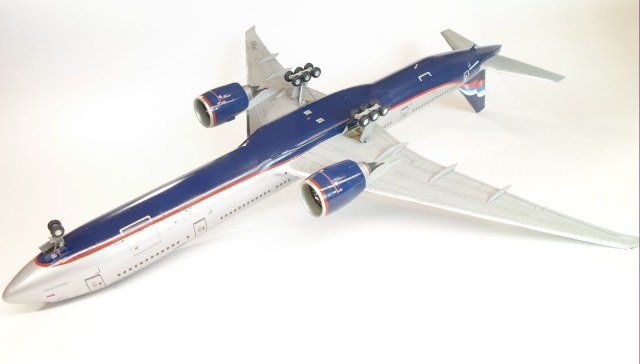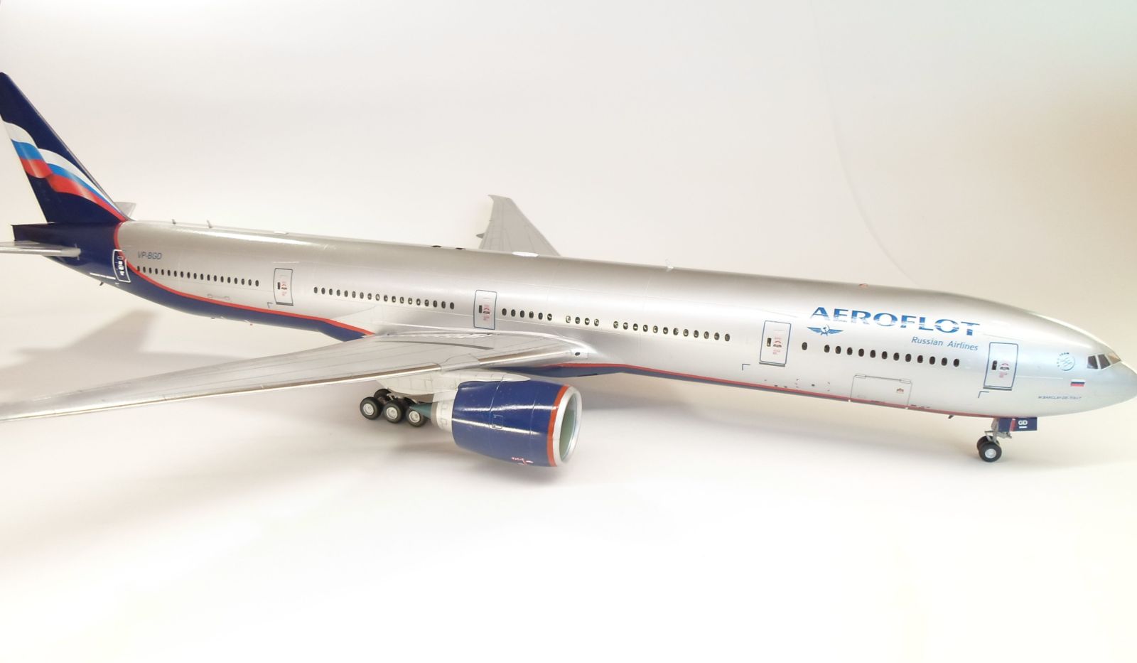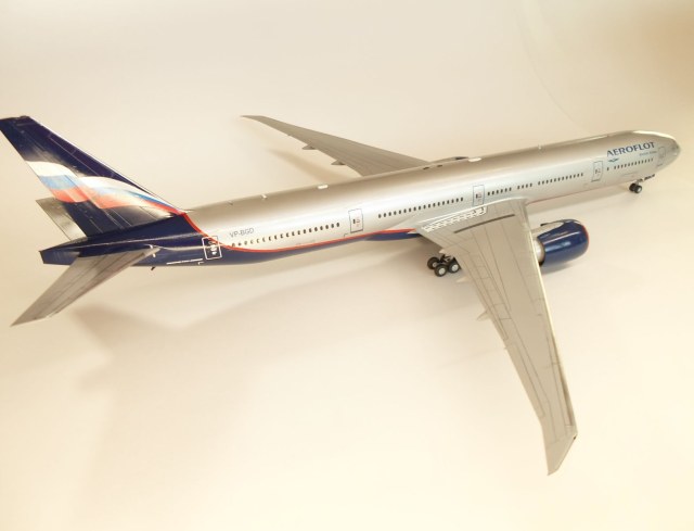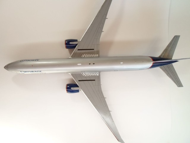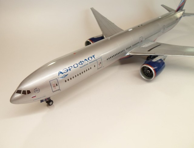 Приветствую коллеги. Стройку модели начал еще летом и вот наконец закончил. В сборке модель порадовала, стыкуется всё идеально, думаю это лучшая модель 777 на сегодняшний день, Звезда на высоте. Модель окрасил в свой любимый Аэрофлот. Декаль от Pas-Decals, красные полосы на фюзеляже и двигателях не использовал так как посчитал их очень бледными не смотря на белую подложку, вырезал трафареты и надул их аэрографом. Очень много изучал фотографии оригинала, убрал часть иллюминаторов. Грунт от Tamiya. Краски и лак тоже от Tamiya. Иллюминаторы залиты жидким стеклом Micro Kristal Klear. Лак глянцевый, а не полу-матовый, неоднократно в комментариях показывал фото аэробусов и боингов, где они глянцевые как зеркало. 3 дня воевал с настройками фотоаппарата и освещением, но так и не смог передать того, что ощущаешь при просмотре модели в живую, да и модель уж очень огромная, ездил специально в магазин за двумя самыми большими ватманами. Ну в общем старался от души, не спешил, приятного всем просмотра.