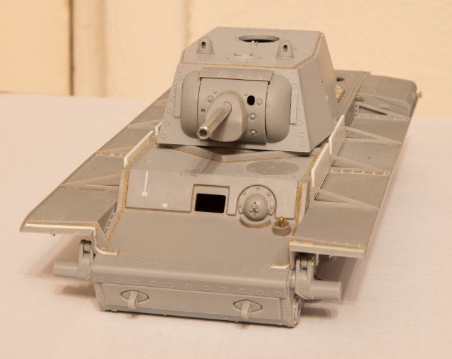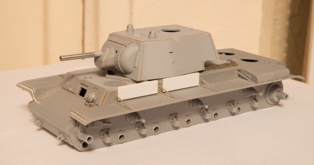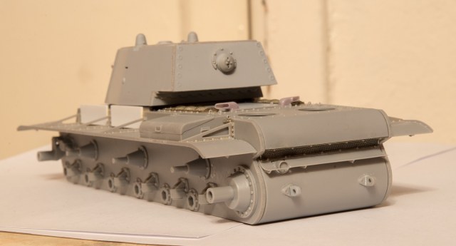 1) Взята башня из набора КВ-1 обр. 1942 г. со сварной башней от Трумпетера же, уменьшена длина её, изменена геометрия стыков бронелистов, переделаны сварные швы, убраны накладки по бокам маски орудия и т.п.