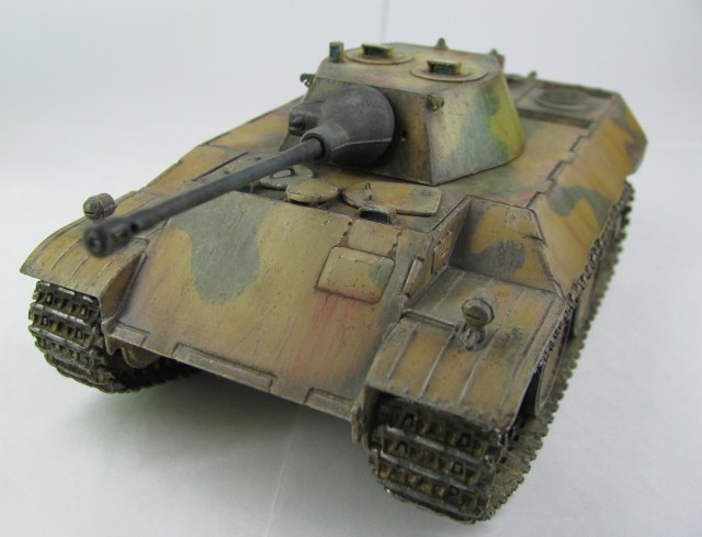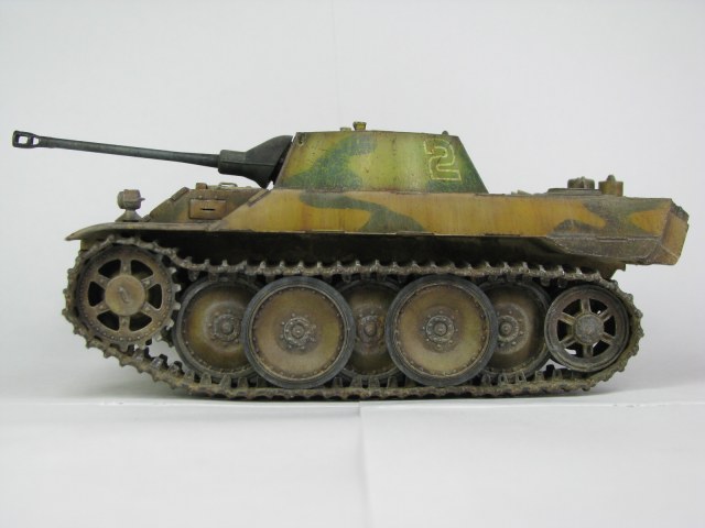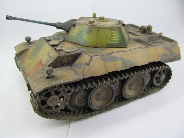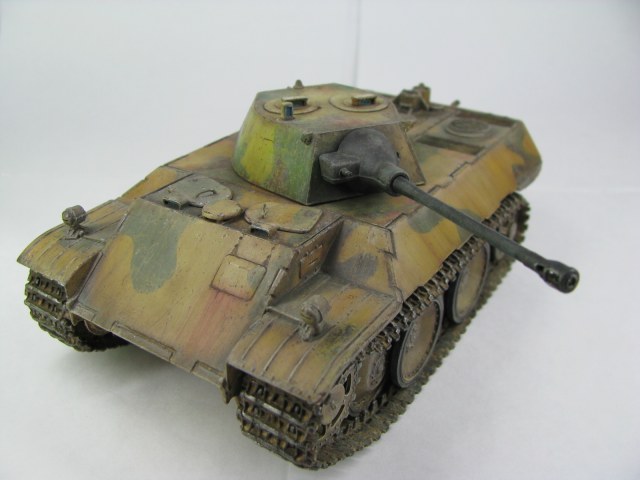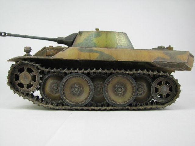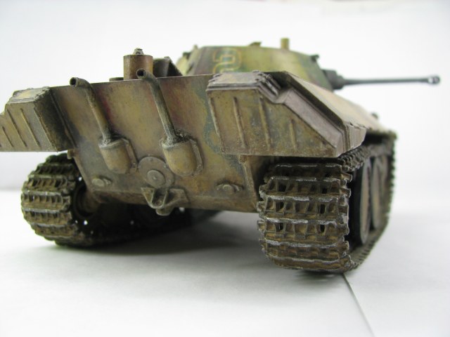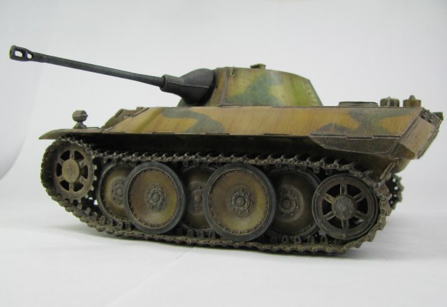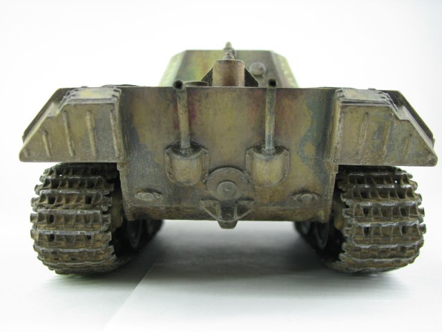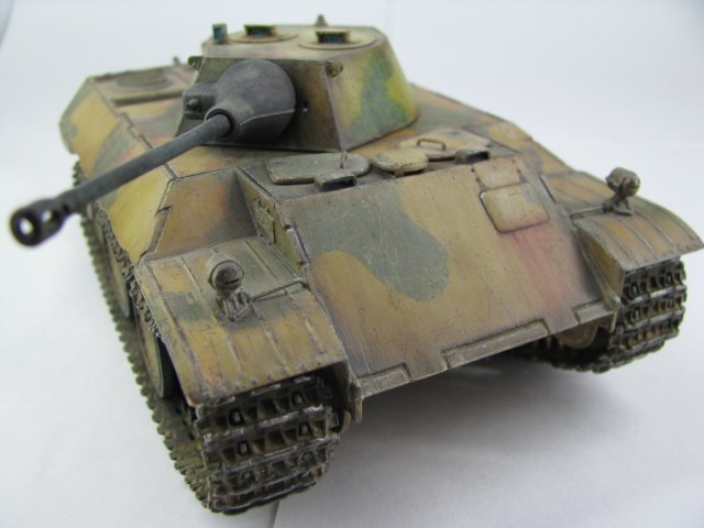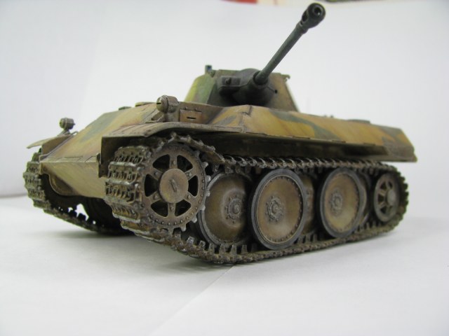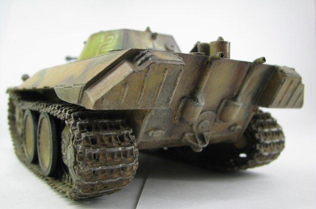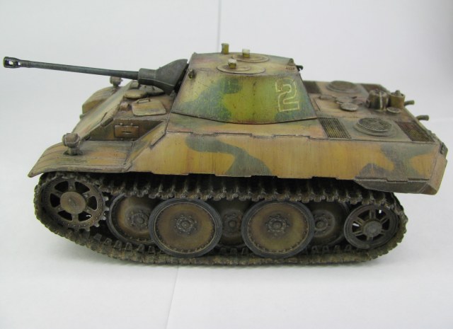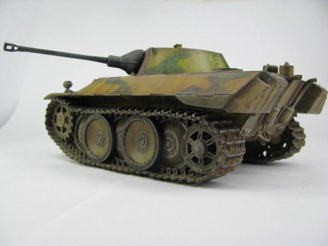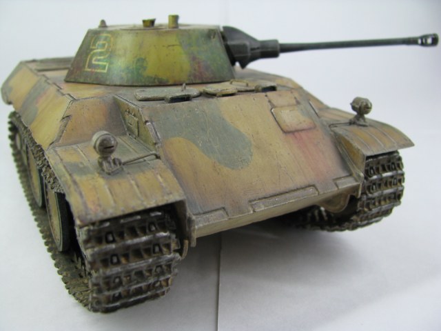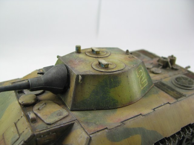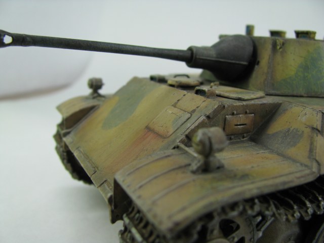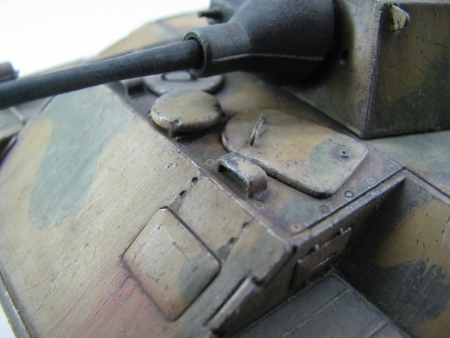 Модель была смыта т.к. покрасил не удовлетворительно -комки под слоем краски.(Смывал растворителем чуть все не испортил ,не знал что "Кротом" надо было ,при смытии модели испортил дымовые мортирки ,другие искать не стал поэтому без них,правая выхлопная труба из литника высверлил обе ,перемычки делать не стал, одно из звеньев гусеницы левая сторона перед,заменено ,взял из набора Звезды Пантера,фаркоп если можно так назвать воссоздан из пластика ) .