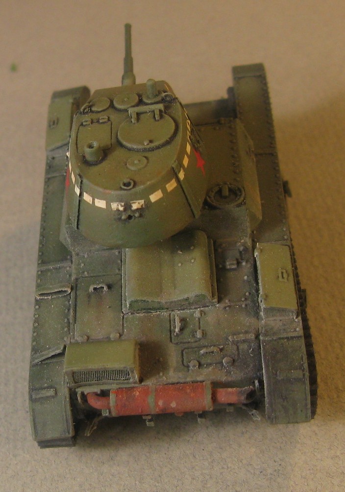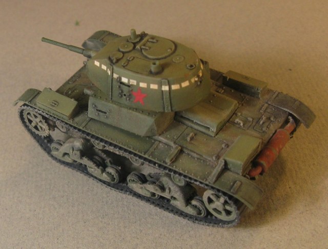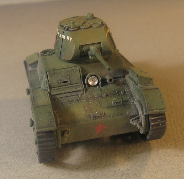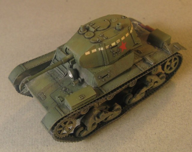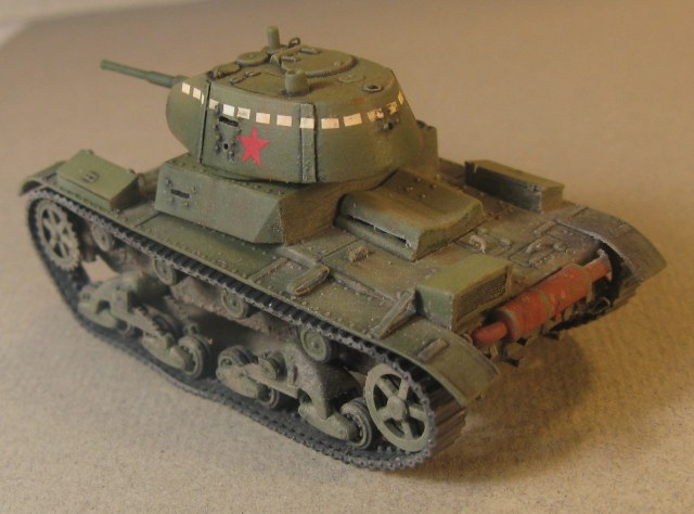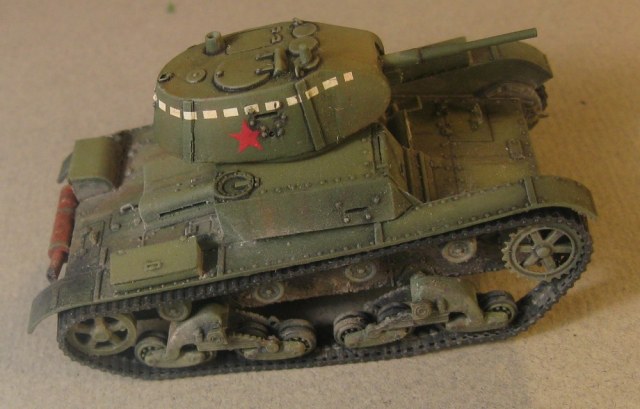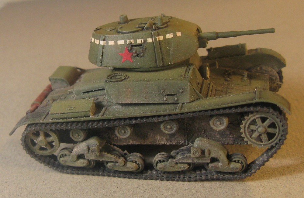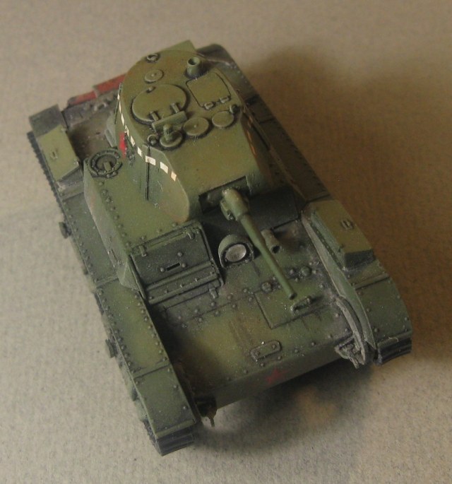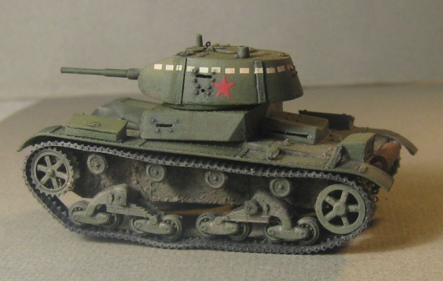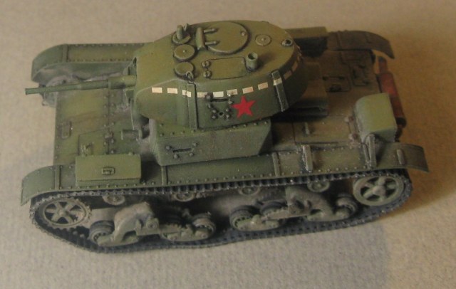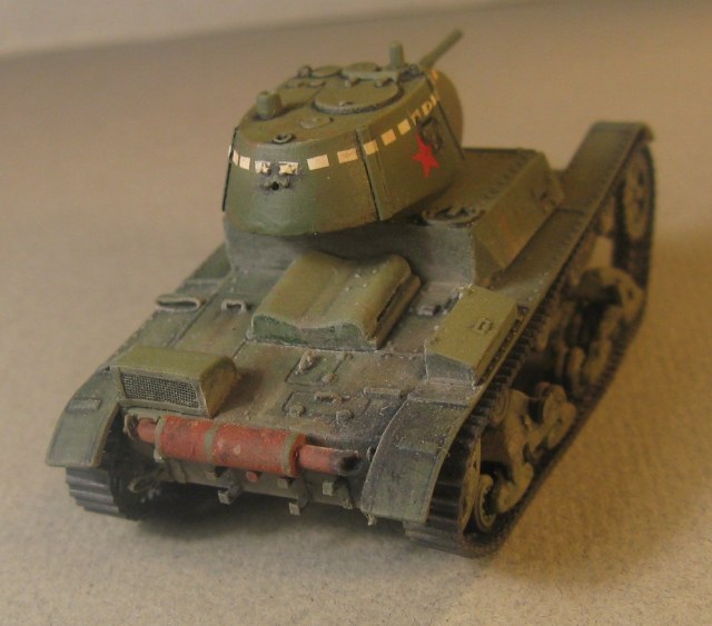 Модель Т-26 от UM. Прорезаны смотровые щели, и кое где добавила клепки, заменила решетку на пакетик, ну и ручки из проволоки. Больше ничего не меняла.