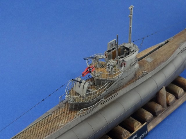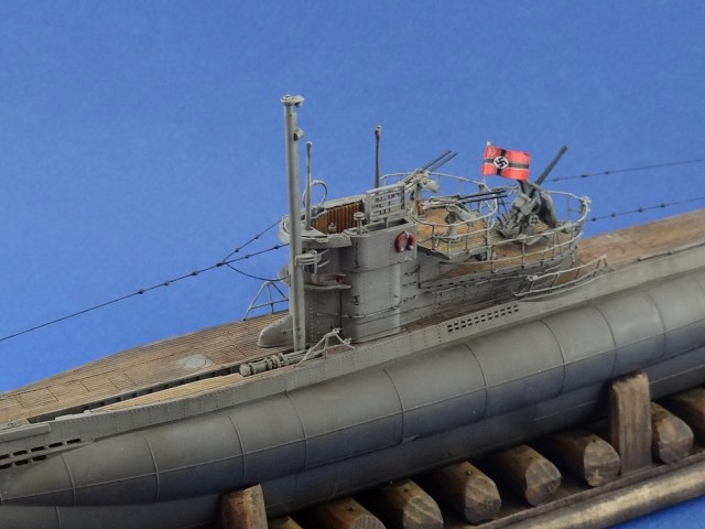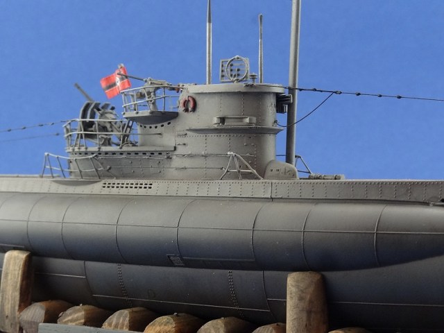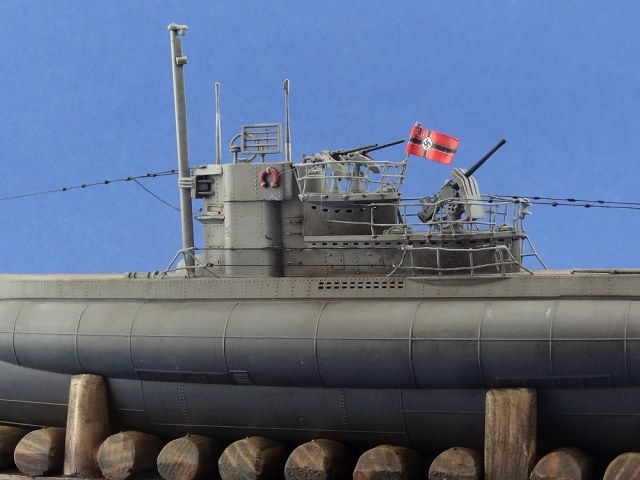 Хорошо "семерка" получилась! Подставка тоже класс! Окраска отличная! Но, на мой взгляд, есть небольшой диссонанс между палубой и корпусом. Палуба старее выглядит. Изоляторы хорошо получились - гармонично! Только вот, насколько я помню, за корзиной их было три и два натяжителя. Итого пять, а не четыре. Провод, что от рубки к тросу идет, должен быть тоньше, чем сам трос - это просто провод. На реальных фотках - это хорошо видно. Флаг... лучше выбросить, извините за прямоту - это вообще не флаг кригсмарине )))