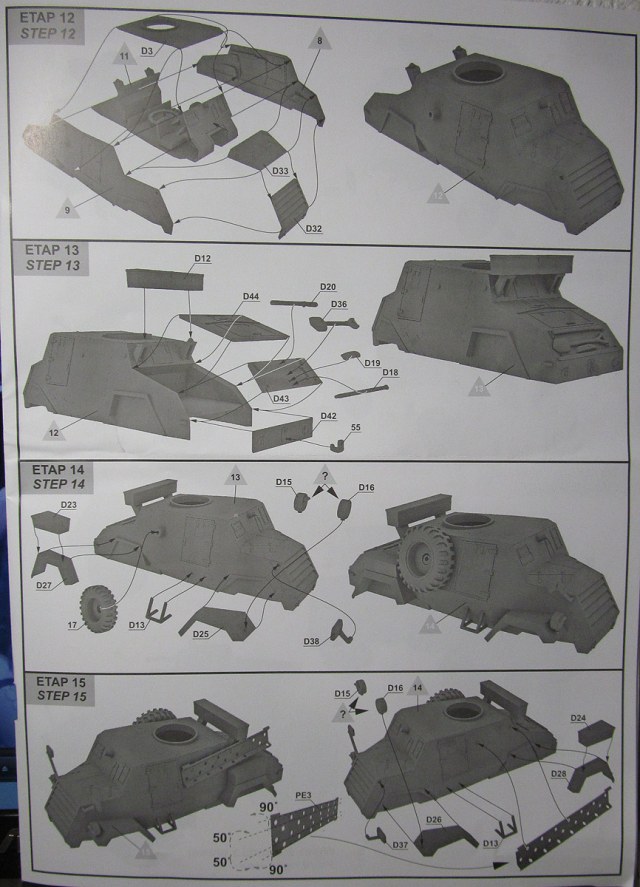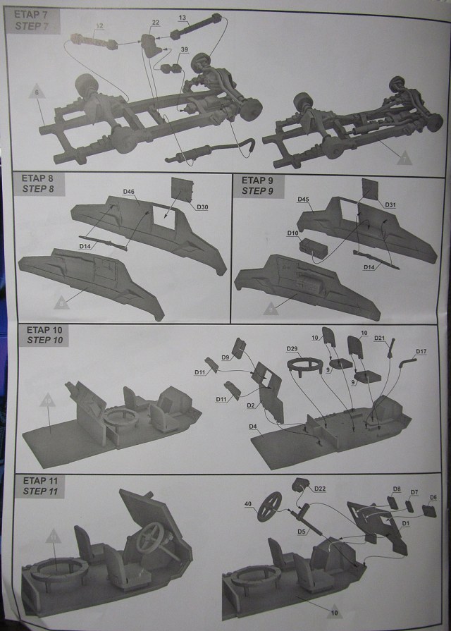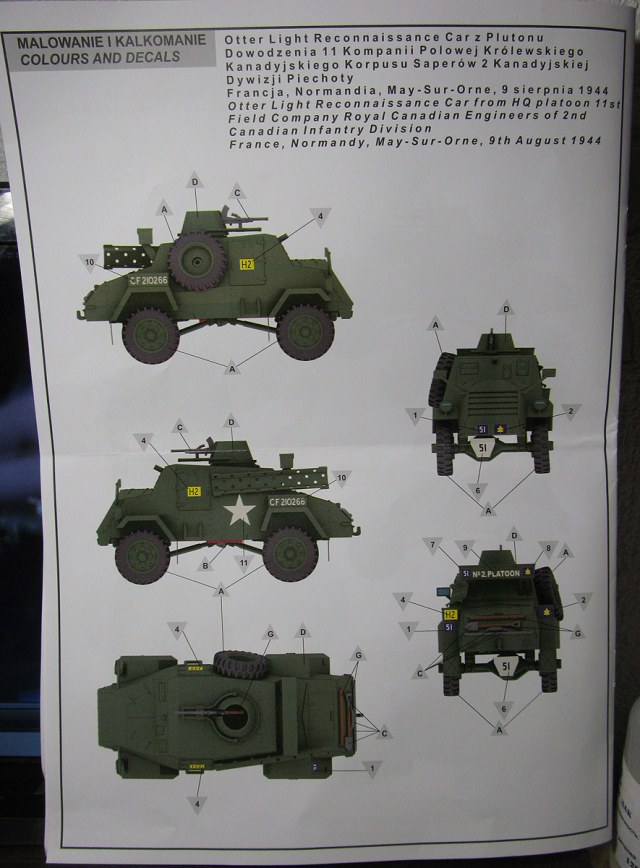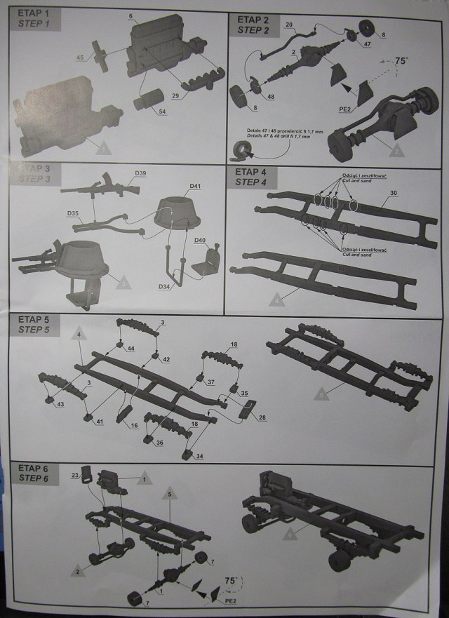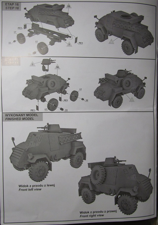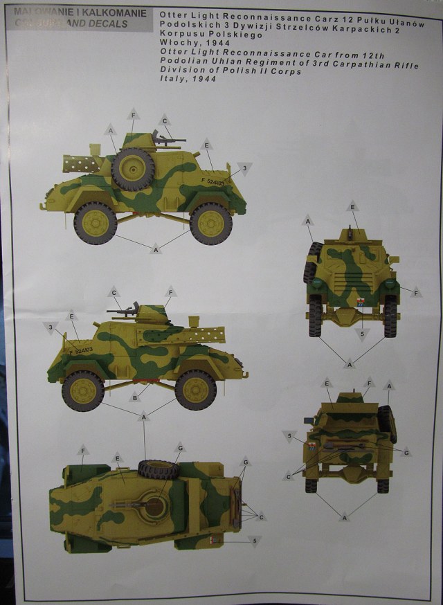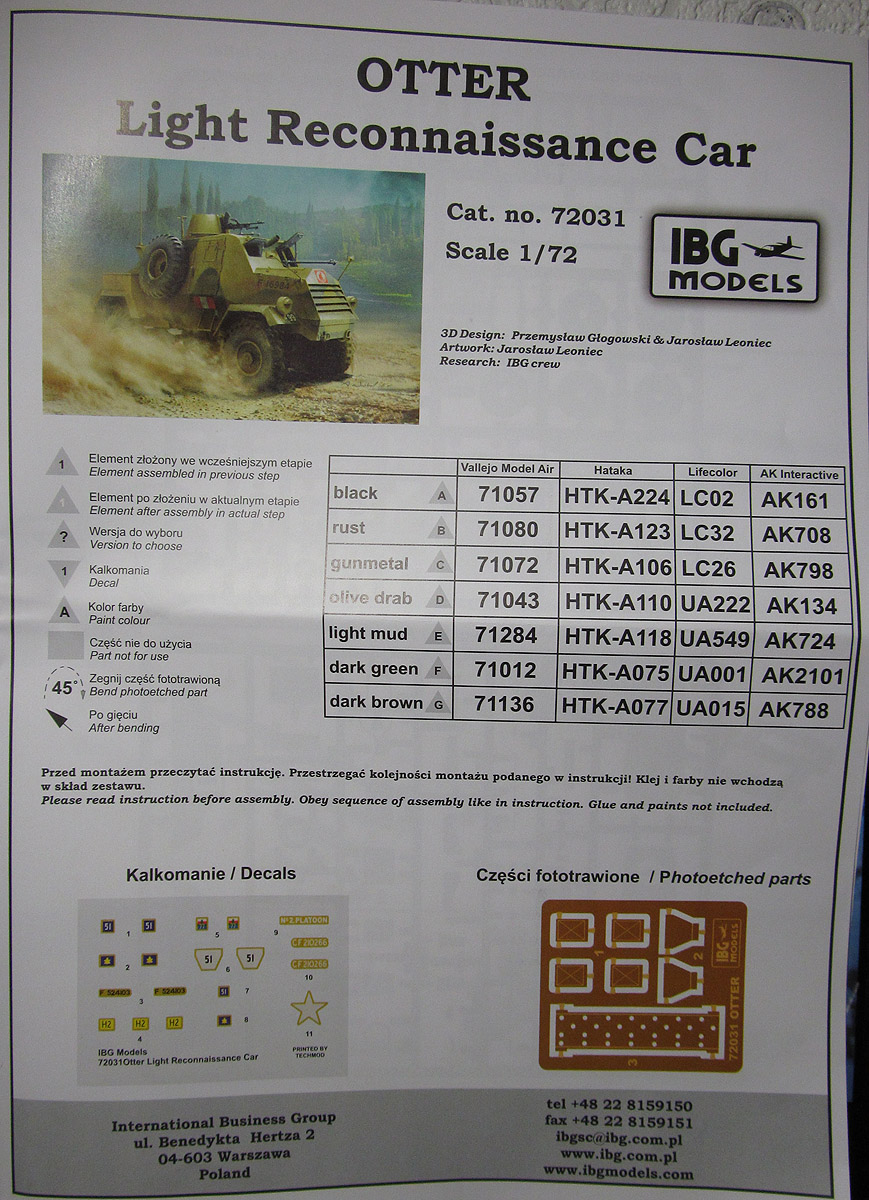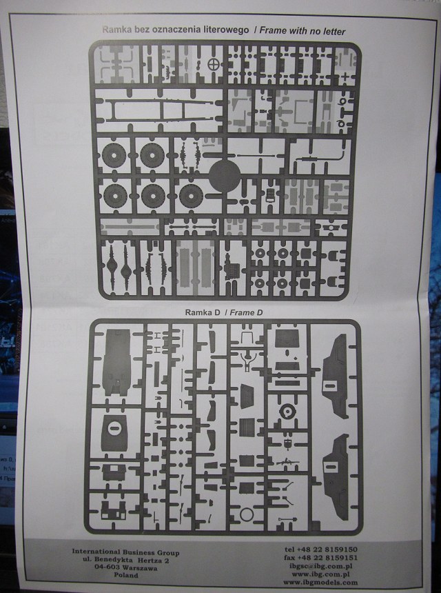 Инструкция на двух языках: польском и английском, исторической справки не содержит. Рисунки сборочных этапов весьма подробные и, на первый взгляд, вполне понятные, выполнены в 3D редакторе. Схема окраски цветная на два варианта. Кроме того, имеется таблица привязки цветов к краскам четырёх производителей.