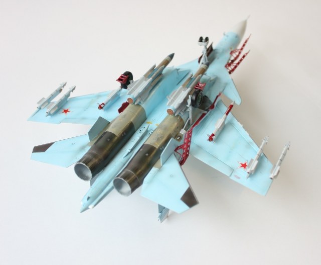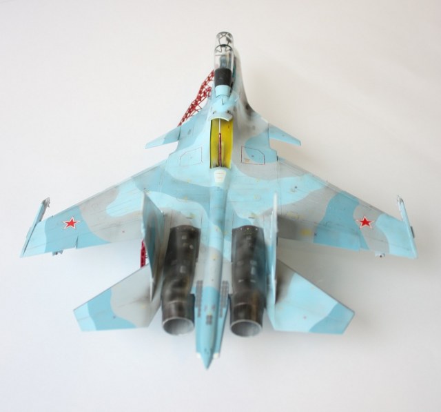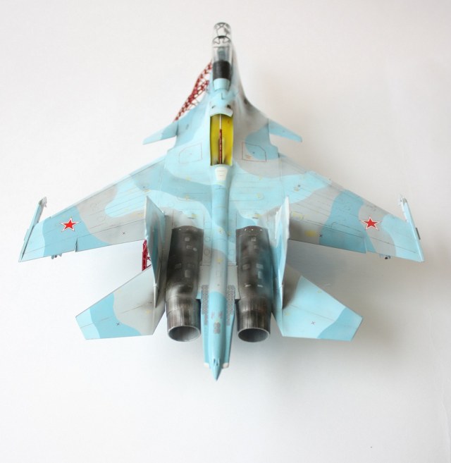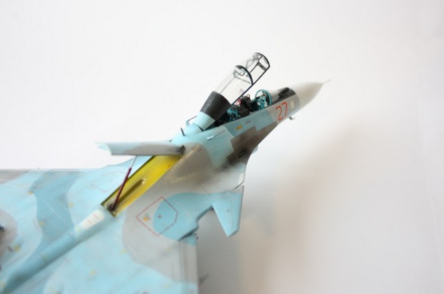 Планер весь от 27см, кабина и гаргрот от 27уб (при сращивании появилась ступенька в 0,5 - 1мм, ожидал я картины похуже, шпатля и наждак решили все). После сращивания начал изготавливать наплыв под ПГО. Налепил пластину из пластика нужной формы, распечатал шаблоны по шпангоутам в масштабе и далее за шпатлю и наждак. Использовал Тамиевскую шпатлю. Отклонил сопла. Перенес ОЛС. Нарастил дошипластиком рули направления. Переднюю стойку переделал в двухколесную. Расшивку убрал в части от 27уб и нарезал основные линии. Кстати машины новые и расшивка с 5-10 метров уже мало заметна. ПГО изьял у су-37 от Звезды (собрал его классе в 8, теперь вот как донор хотя бы пригодился). В принципе все по перепилу.