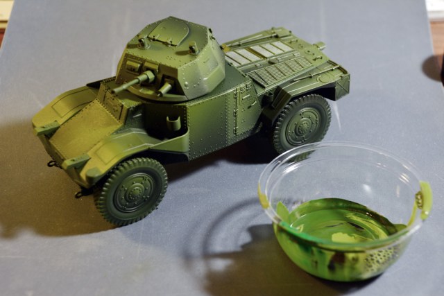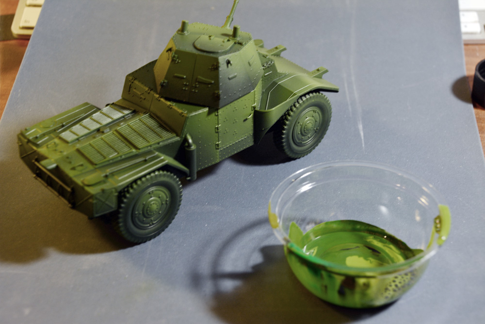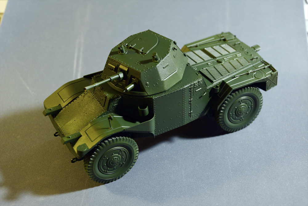 Жена поехала в торговый центр и я попросил купить мне простенькую модель на вечер. Признаться, я рассчитывал на какой-нибудь самособирающийся самолетик в 72-ом, и очень удивился, когда она вручила мне модель броневика в 35-ом. Тем более о таком я и не слышал. Инструкция и количество литников, казалось, ставили крест на идее блиц сборки.. Однако, изучив все это богатство я понял, что половина инструкции и деталей – это описание сборки интерьера и второй модификации. Сразу решив, что интерьер я делать не буду, понял, что на самом деле, склеив десяток деталей, модель будет почти готова. Так и получилось. Короче, на сборку потрачено часа два, большая часть времени из которых, ушла на аккуратную обработку следов отделения от литника. Две огромные антенны(?) делать не стал, они выглядят довольно непривычно и очень отвлекают на себя внимание. Зато сделал из иглы от шприца пулемет.