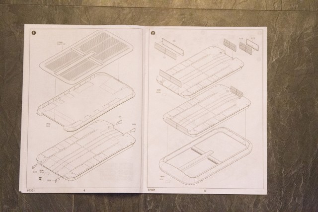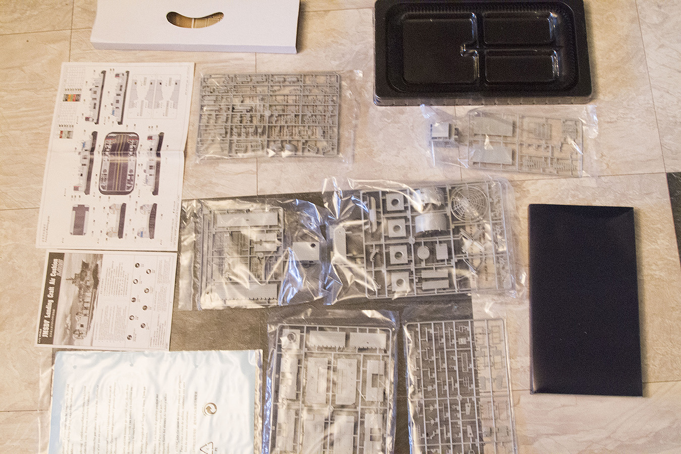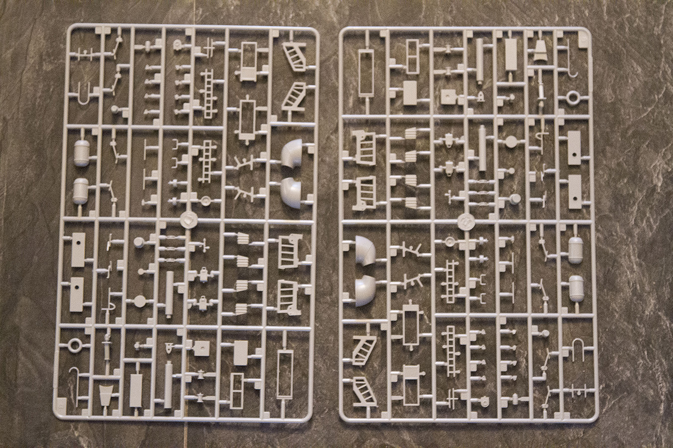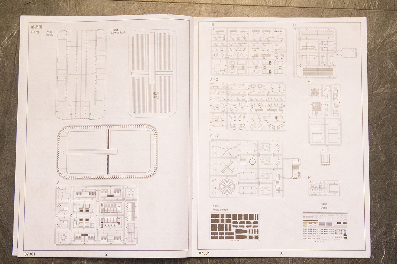 Впервые купил Trumpeter. Любопытно было распаковывать. Пластик весь отдельно в пакетиках, фототиснение в пакете и в коробке, чтоб не поломалось. Резинка в пластике, чтоб сохраняла форму. Корпус в отдельных пакетах, без литья и заусенцев. Декали тож в отдельном пакете с подложкой. Инструкция и схема окраски отдельно. Это не совсем удобно. Т.е. схема конечно хорошо. Но неплохо бы обозначить и в инструкции т.к. некоторые детали сложно окрашивать после приклеивания и их можно пропустить. Rewellовскою цветную инструкцию считаю совершенной.