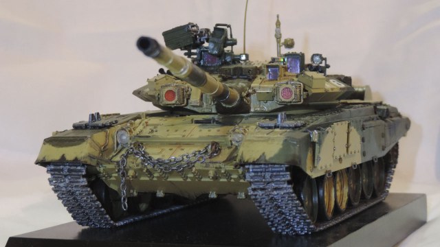 Советую начинать работу над любой моделью с изучения фото реальных машин. В сети этого добра - ну очень много! Тогда бы Вы не стали вешать на этот танк цепь и ложить на полки траки (подумайте логически - как они там держаться?). Антенна загнута не реально... Сетки над радиаторами подклеены с "дырками" и вы сами акцентировали на этом внимание с помощью 6-го фото. Для тросов лучше использовать многожильный провод подходящего диаметра - нитка не совсем корректный вариант.