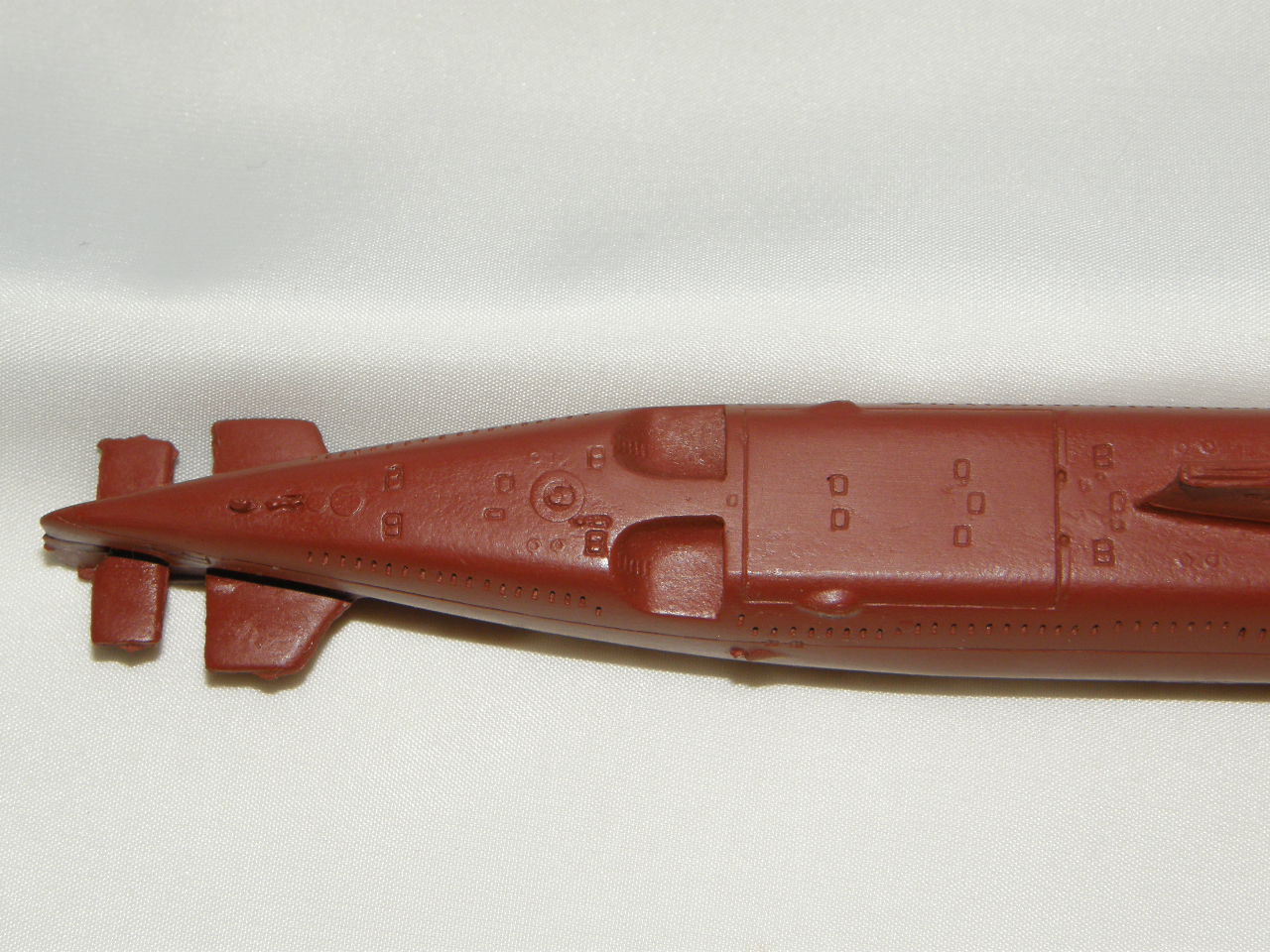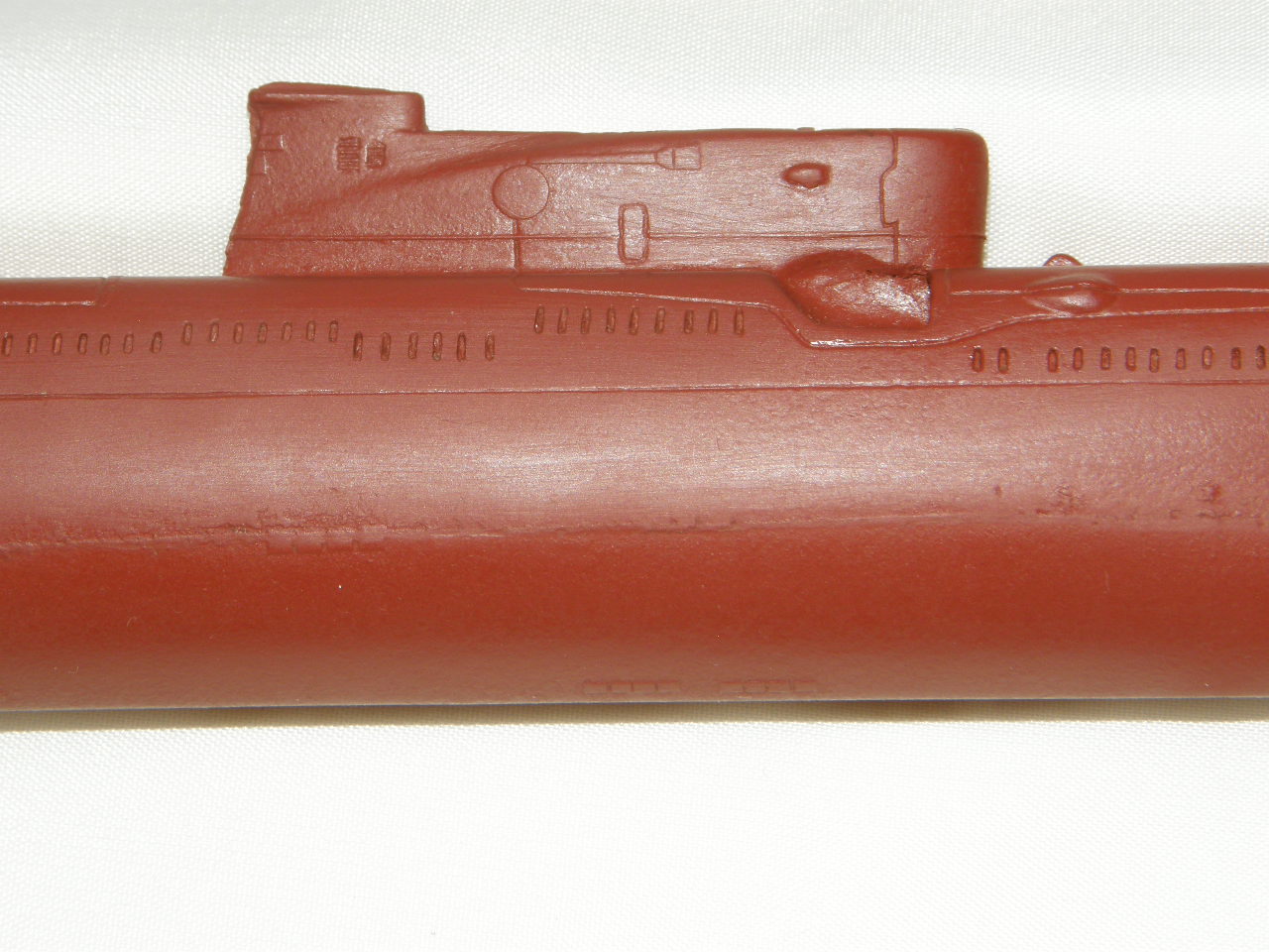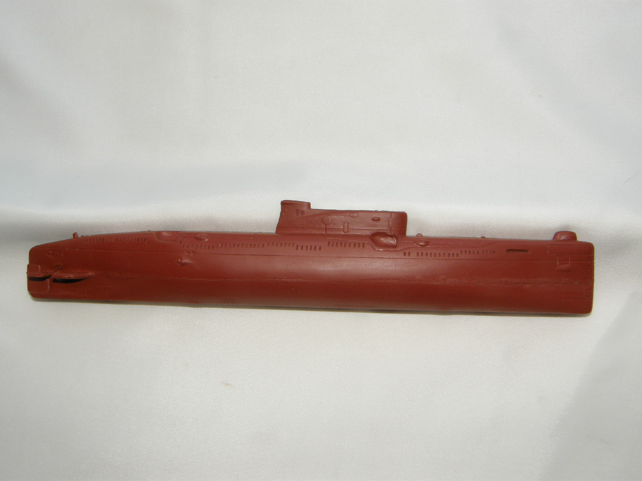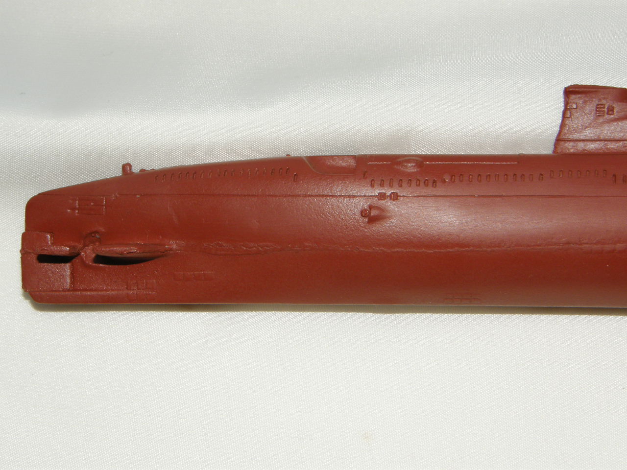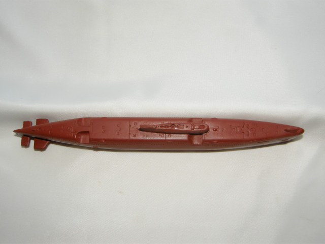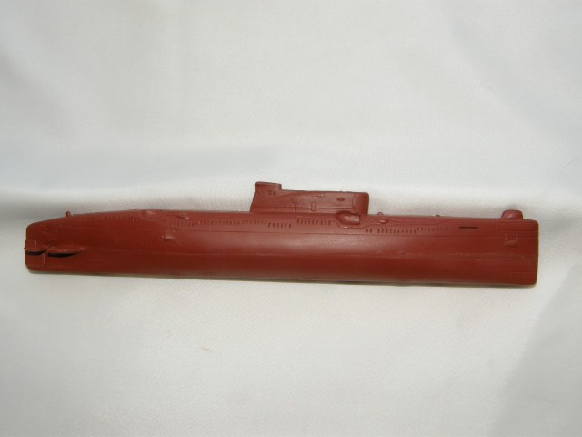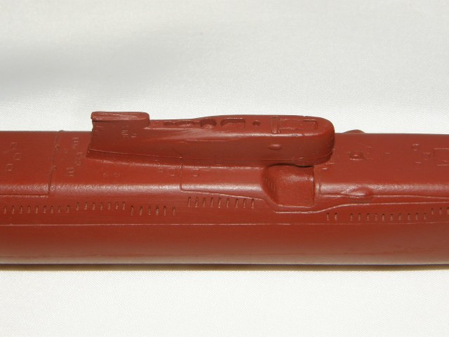 Модель лодки отлита из смолы красно-коричневого цвета для крепления противогидлооркационного покрытия подводных лодок. Смола на ощупь чуть-чуть теплая, довольно легко обрабатывается шкуркой и надфилями после смачивания ее водой. Все шпигаты, решеточки, рули и т.д. отлились качественно. Имеется небольшой облойчик из-за стыковки формы от верхней и нижней половинок, но это легко устранимо. Расшивка глубоковата и рассчитана на обязательную обработку всей модели шкуркой, наверное так и надо. Впервые волнорезы крышек торпедных аппаратов сделаны расшивкой, а не слегка выпирающими цилиндрами.