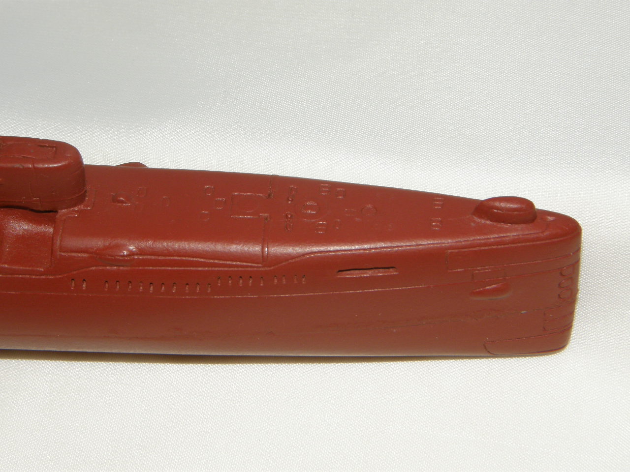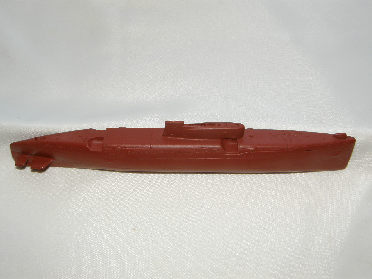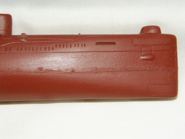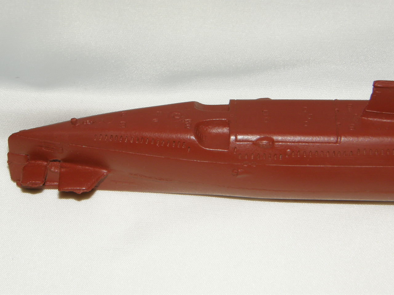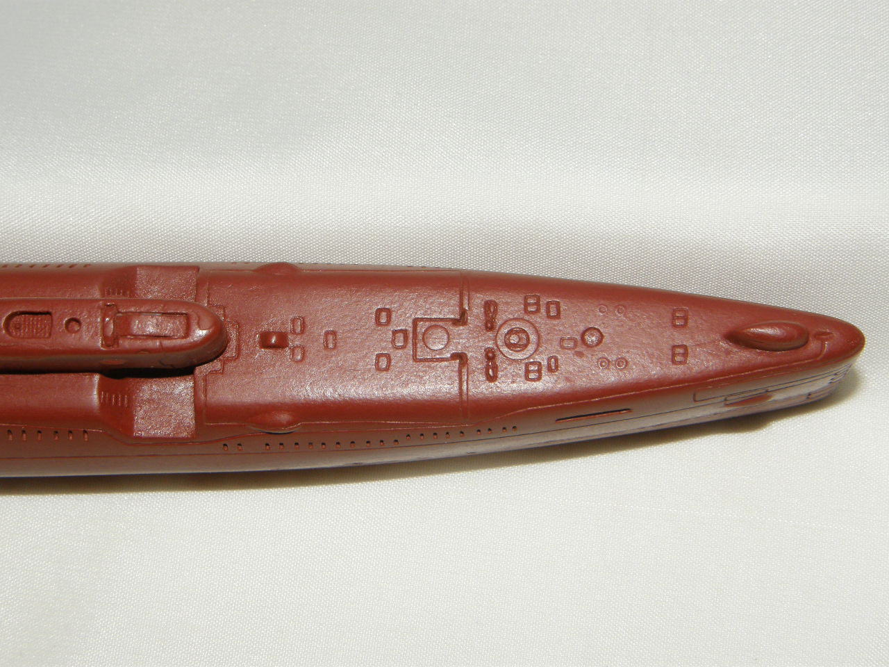 Модель лодки отлита из смолы красно-коричневого цвета для крепления противогидлооркационного покрытия подводных лодок. Смола на ощупь чуть-чуть теплая, довольно легко обрабатывается шкуркой и надфилями после смачивания ее водой. Все шпигаты, решеточки, рули и т.д. отлились качественно. Имеется небольшой облойчик из-за стыковки формы от верхней и нижней половинок, но это легко устранимо. Расшивка глубоковата и рассчитана на обязательную обработку всей модели шкуркой, наверное так и надо. Впервые волнорезы крышек торпедных аппаратов сделаны расшивкой, а не слегка выпирающими цилиндрами.
