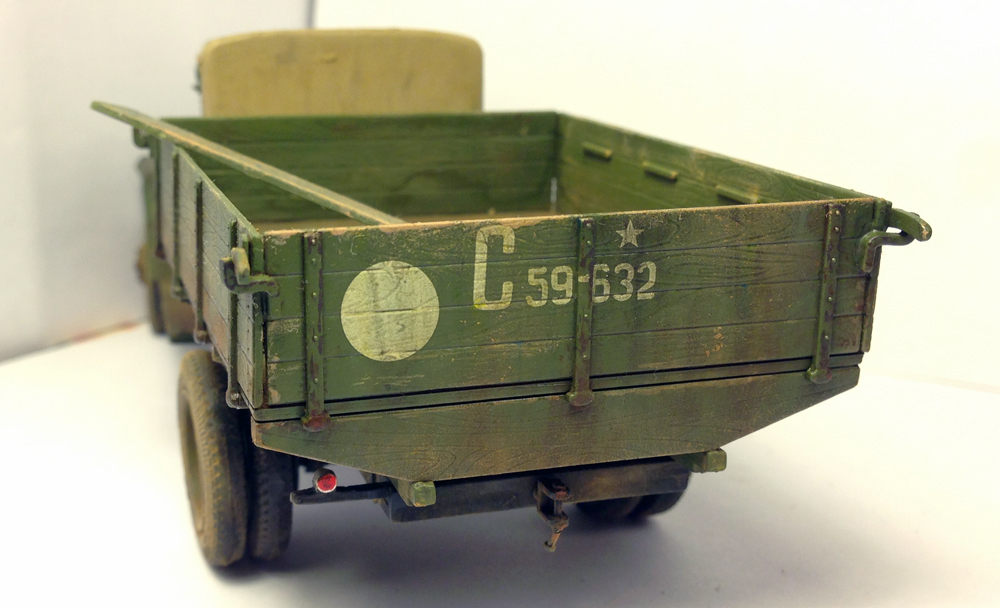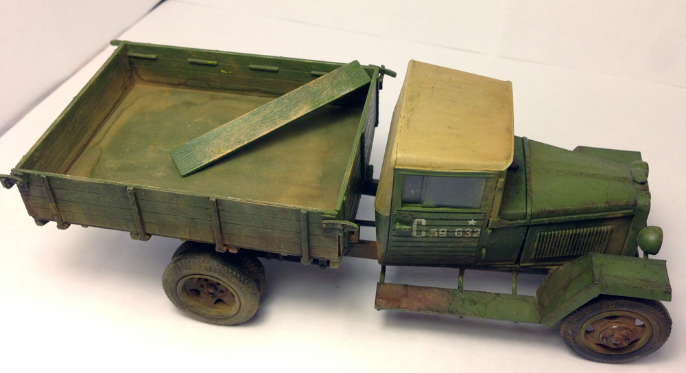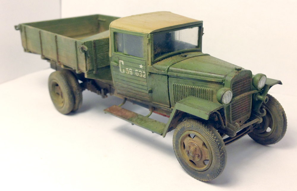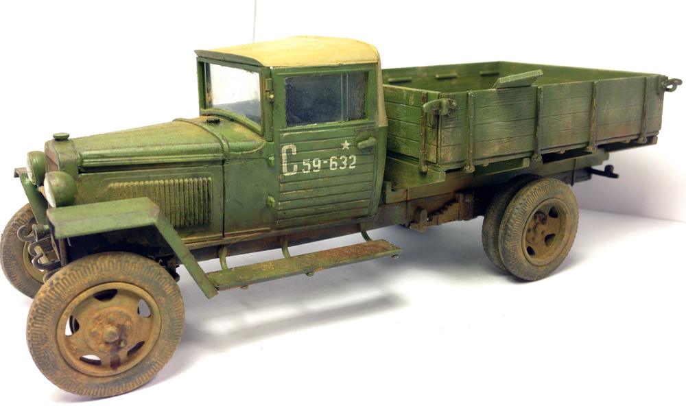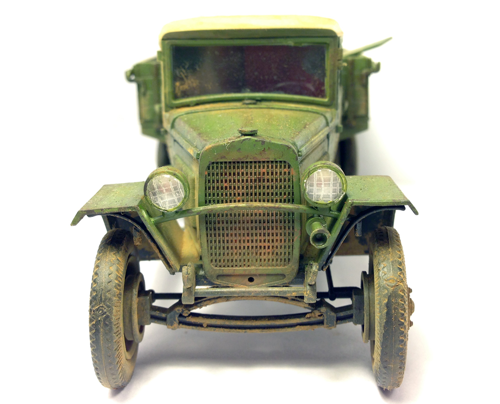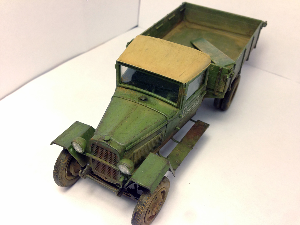 Стёкла фар всё же надо было вклеить так, как они должны быть. Брезент крыши темнее гораздо должен быть. Такие мелочи портят хорошую в целом картину.