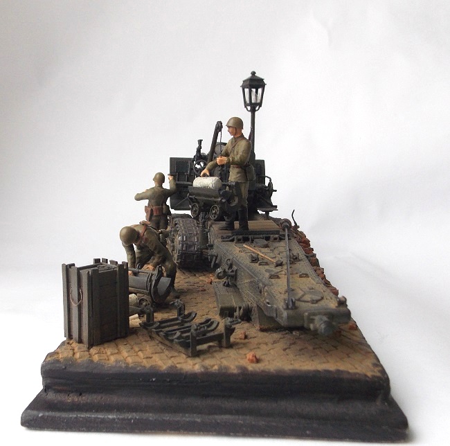 Основание диорамы - гипс, имитирующий мостовую, поребрик и тротуар. Фонарь взят из набора , в нем доработаны выбитые стекла. Кирпичи изготовлены из школьного ластика.