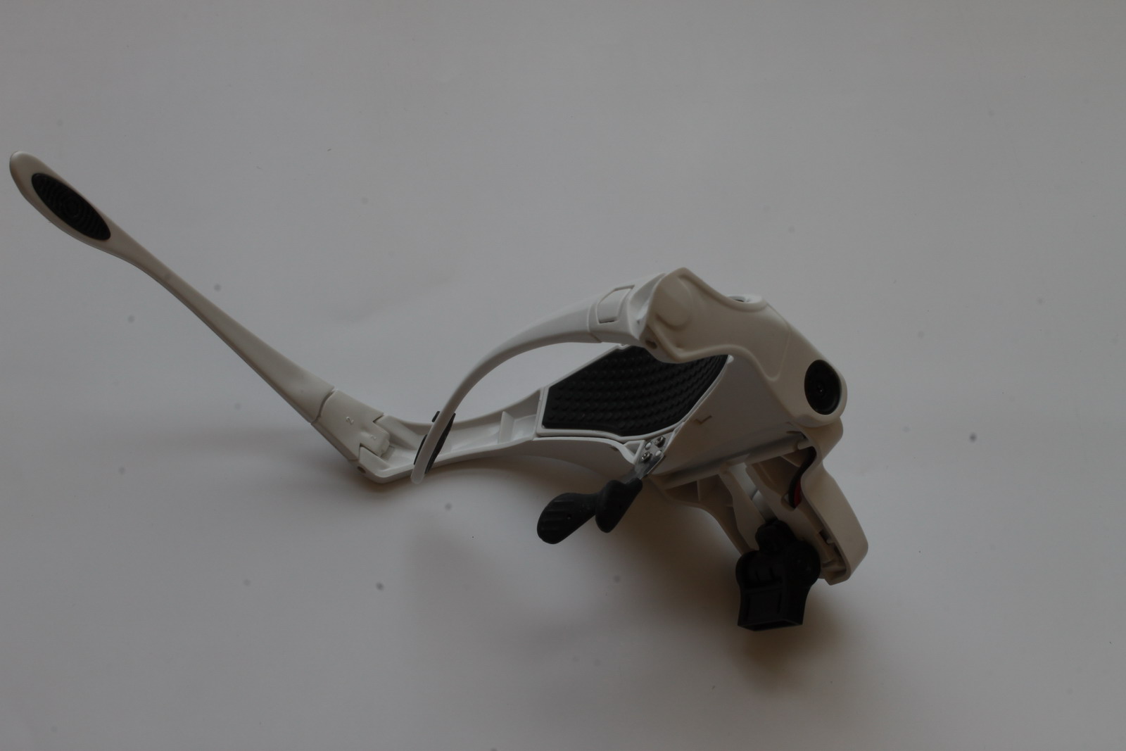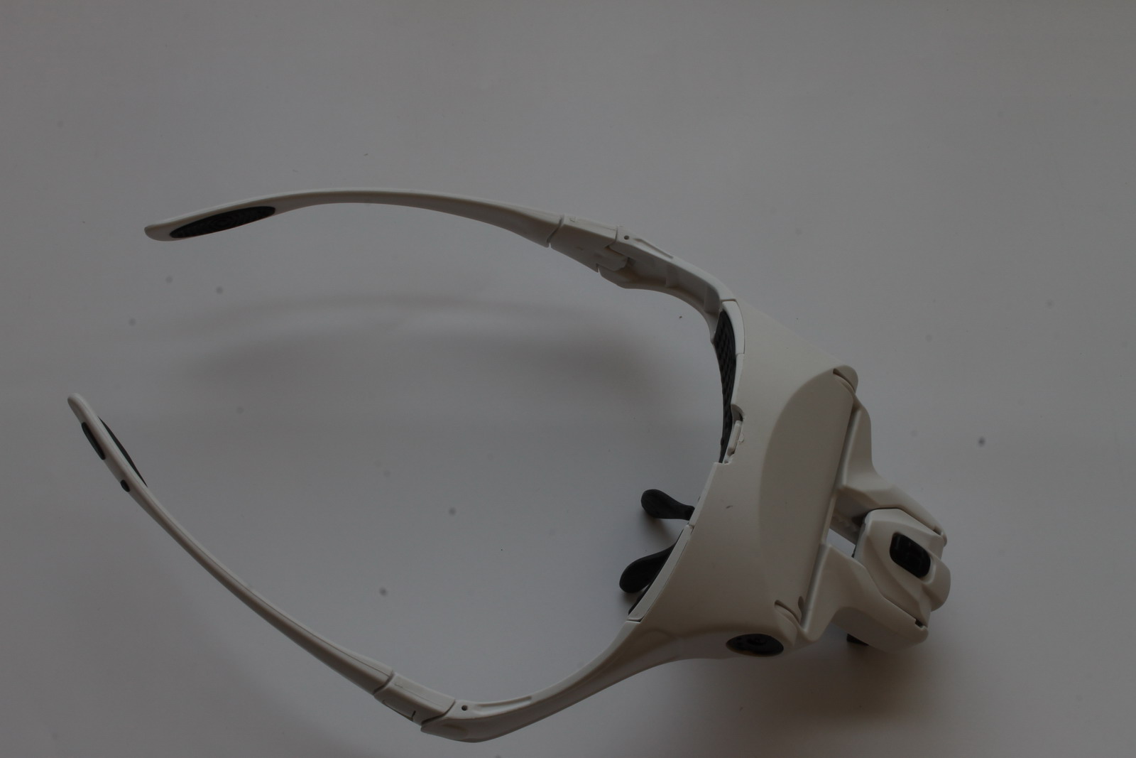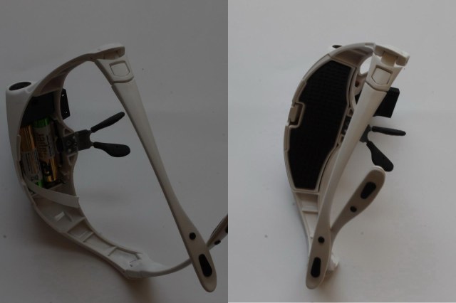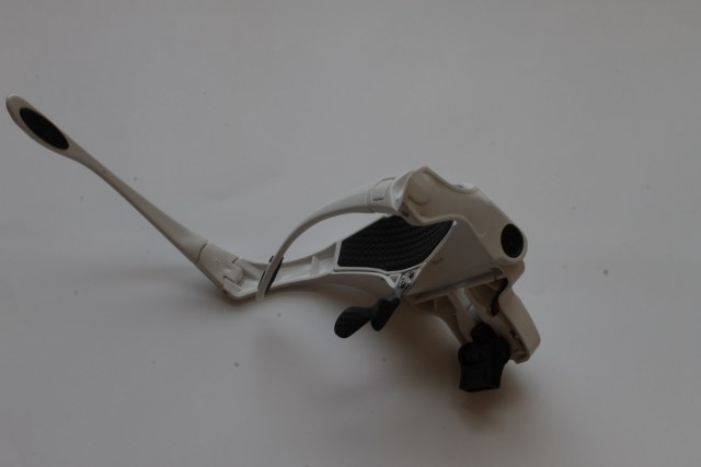 Итак, что имеем. Сложная оправа футуристического вида из белой пластмассы. Внутри оправы батарейный блок на 3 АА (пальчиковые) батарейки с добротной крышкой (что не откроется и батарейки не вывалятся прямо на нос). Дужки складные, но их можно отстегнуть и вставить регулируемый ремень-резинку. Очки уверенно сидят на лице благодаря хорошей конструкции в том числе носовых упоров. Все элементы, опирающиеся на кожу (налобник, носовые упоры, душки) имеют прорезиненные гофрированные вставки, не скользящие, не давящие на кожу и не позволяющие ей потеть.