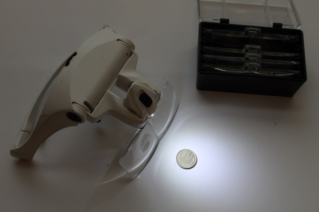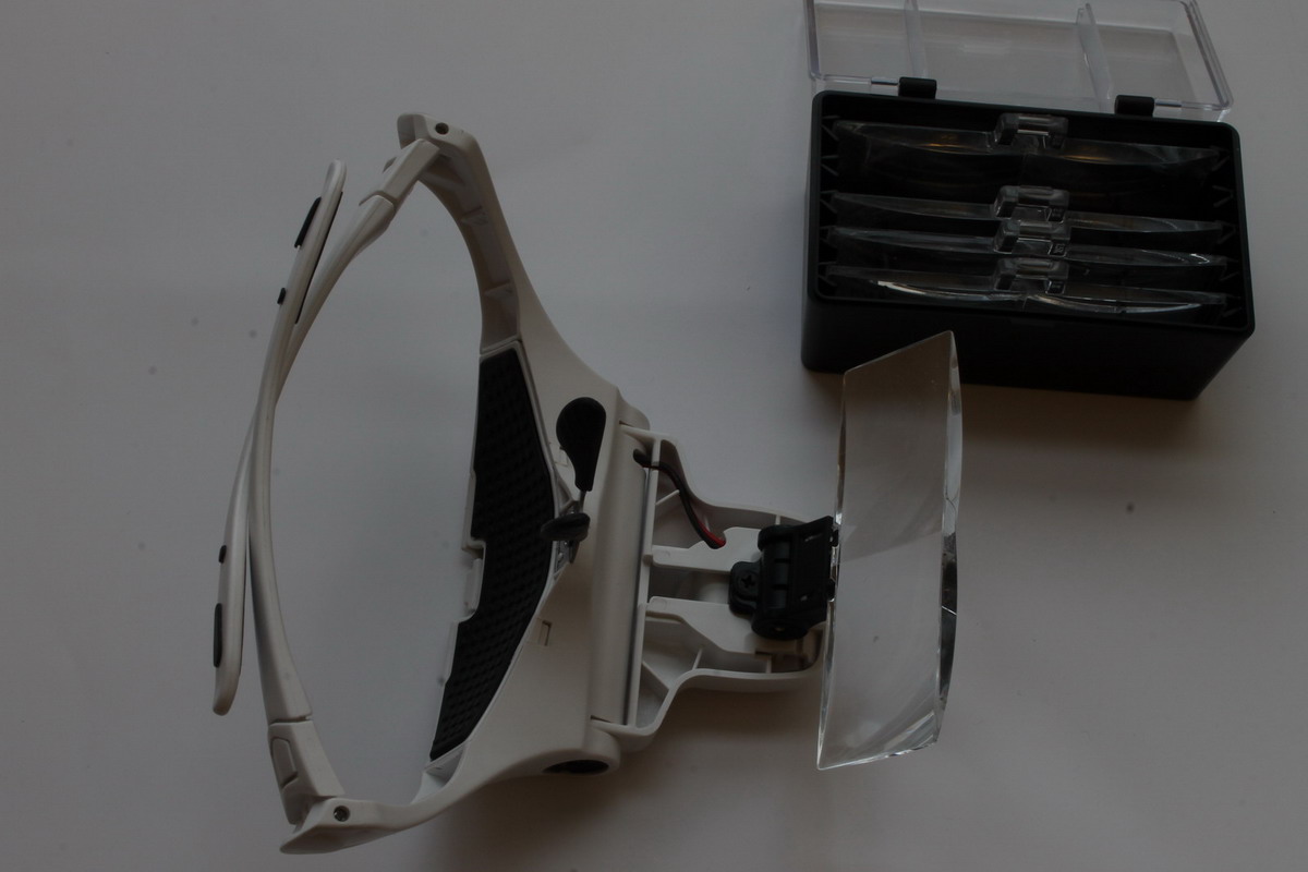 Ну и главное - лупа. Набор имеет пять бинокулярных пластиковых линз с увеличением от 1,0 до 3,5. Каждая имеет свое фокусное расстояние. ставятся только по одной. Оптимальная для меня пока 3.0.