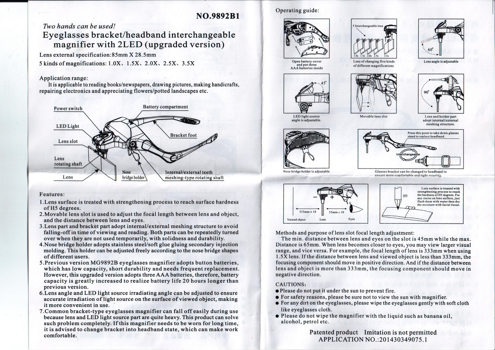 Спереди на очках имеется отклоняемый козырек, удерживающий подвижный фонарик и подвижный кронштейн для сменных линз.