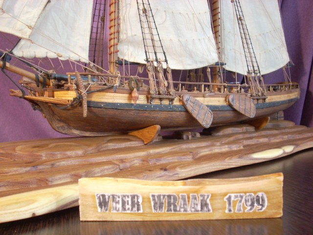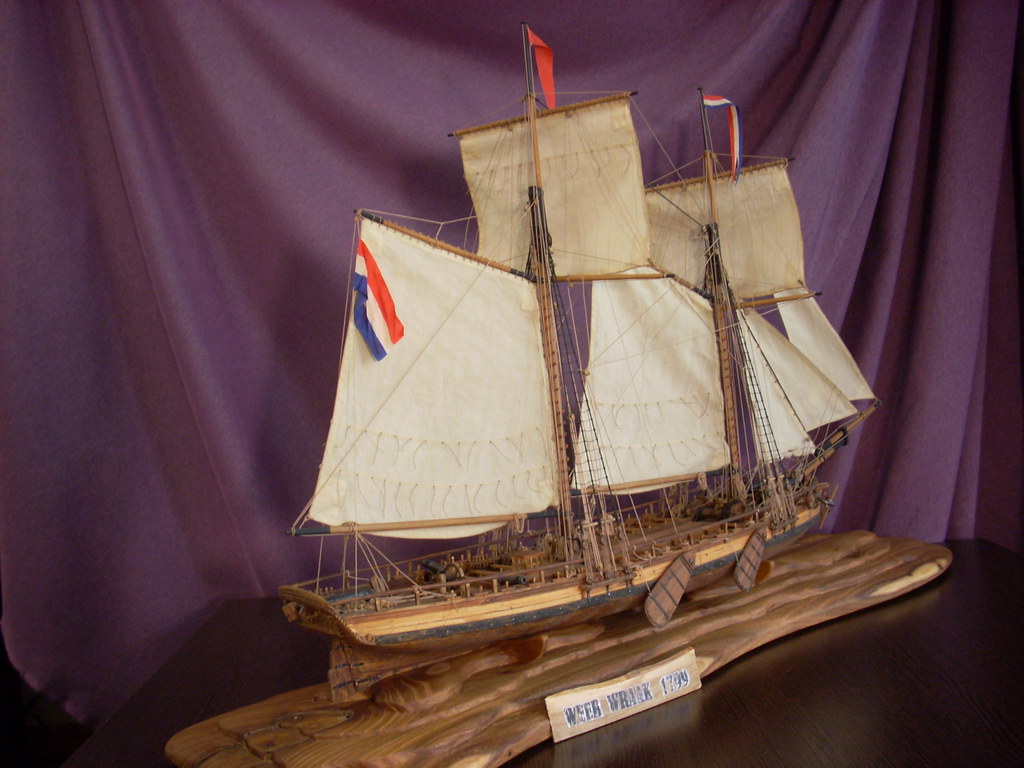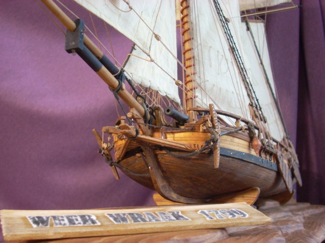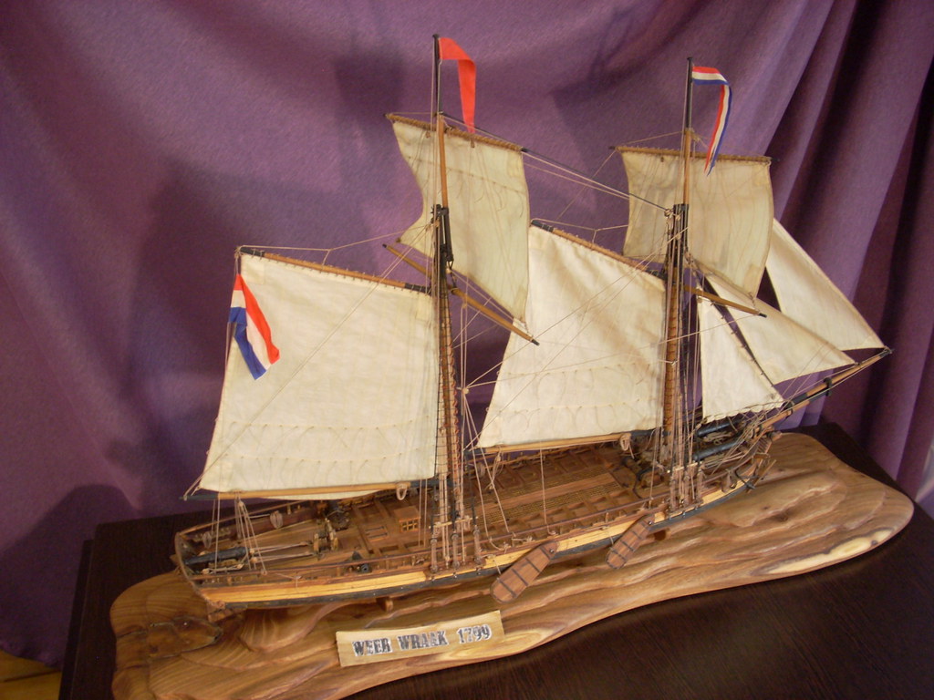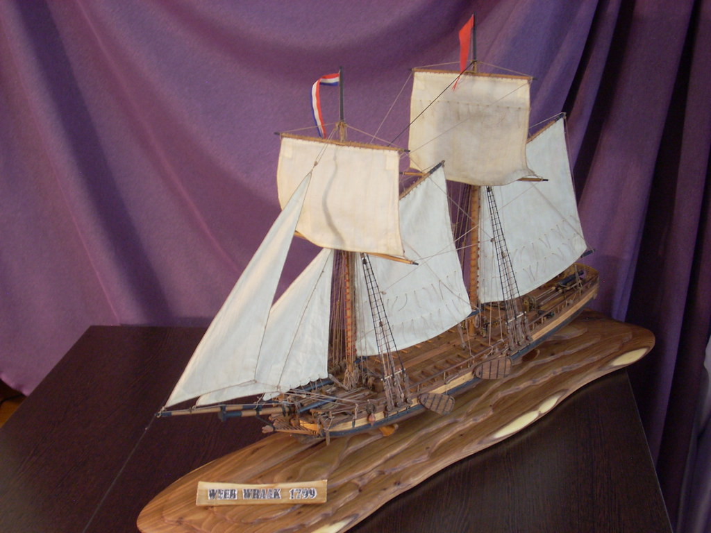 Года 3 с небольшим назад попался мне этот кораблик. Сильно заинтересовал... Информации было мало. Если по корпусу еще ничего, то по парусному вооружению два рисунка...(без привязки к этому судну....) Эта модель имеет прототип в натуре...... Историческая справка - - "Судно WEER WRAAK датской постройки по французскому дизайну (канонерская галера). Построено в 1799 году ,15 июня сдали в эксплуатацию. Куплено Голландией для войны с Англией. 12 августа вступило в боевые действия. Перед вторым своим боем экипаж сошел на берег и сделали береговую батарею, а командир с тремя бойцами вступил в бой с бригом и катерами, был подбит и подожжен (13 августа....) в 17.00 был брошен, через 3 часа взорвался! "