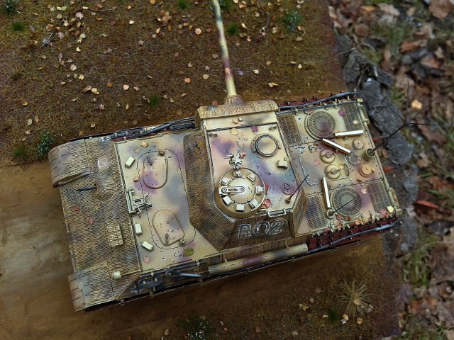 Итак, друзья, представляю вашему вниманию одну из своих крайних работ. За основу была взята довольно известная машина Ханса Груле за номером R02 , воевавшая в Нормандии в составе 1. SS-Panzer-Division LSSAH. На всех фотографиях в интернете машина выглядит довольно чистой и новой, поэтому пачкать грязюкой ходовую не стал, немного припылил пигментами. Для фотографирования была изготовлена подставка с учетом времени года и предполагаемого пейзажа. Поскольку это просто подставка для фотографирования, а не диорама, не стал делать следы от гусениц, ибо у всех танков они разные.