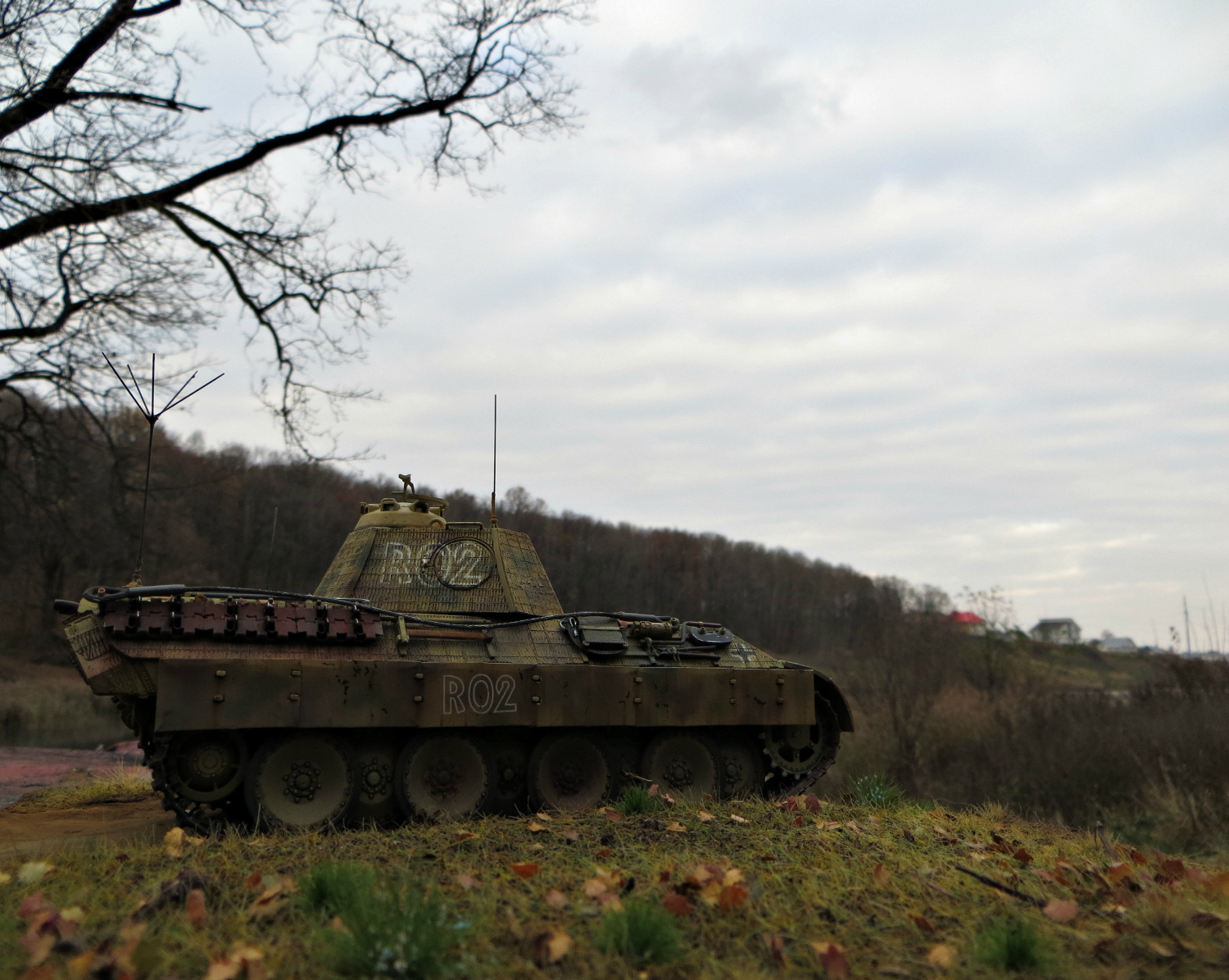 Съемку проводил на природе при естественном освещении. Кстати, пока транспортировал танк до полигона, случилось страшное – упала коробка с моделью. Результат: 3 отломанные антенны, слетевшая гусеница (видно на некоторых фото слишком большой провис), облетевшая краска с торца дульного тормоза пушки и пламегасителя MG-34. Немецкий танк был наскоро отремонтирован в полевых условиях с помощью супер-клея и русского мата. А вот замазать сколы краски сажей от костра мне так и не удалось.