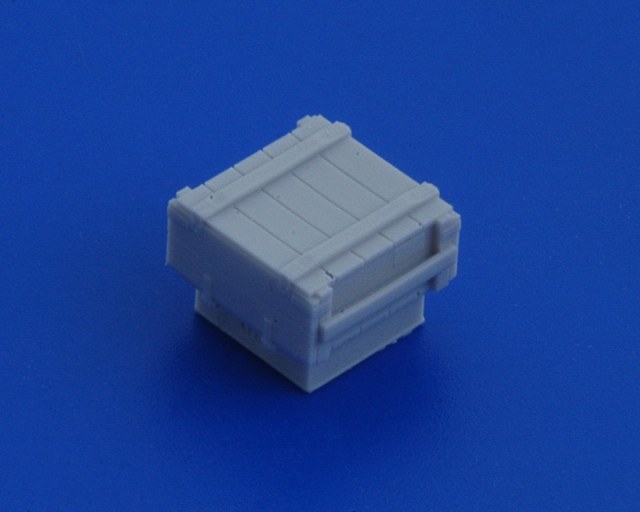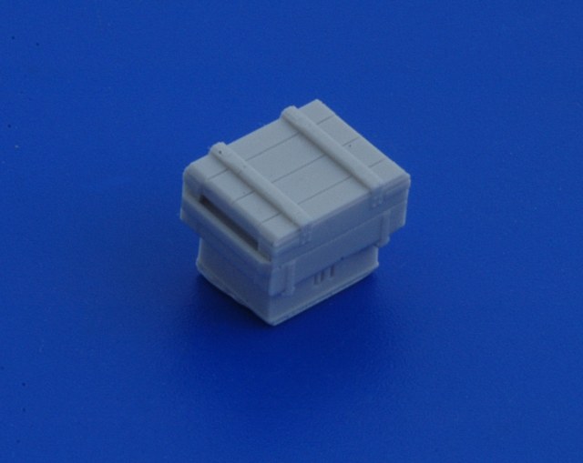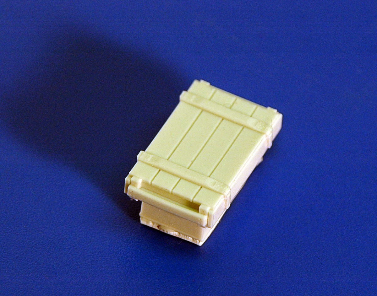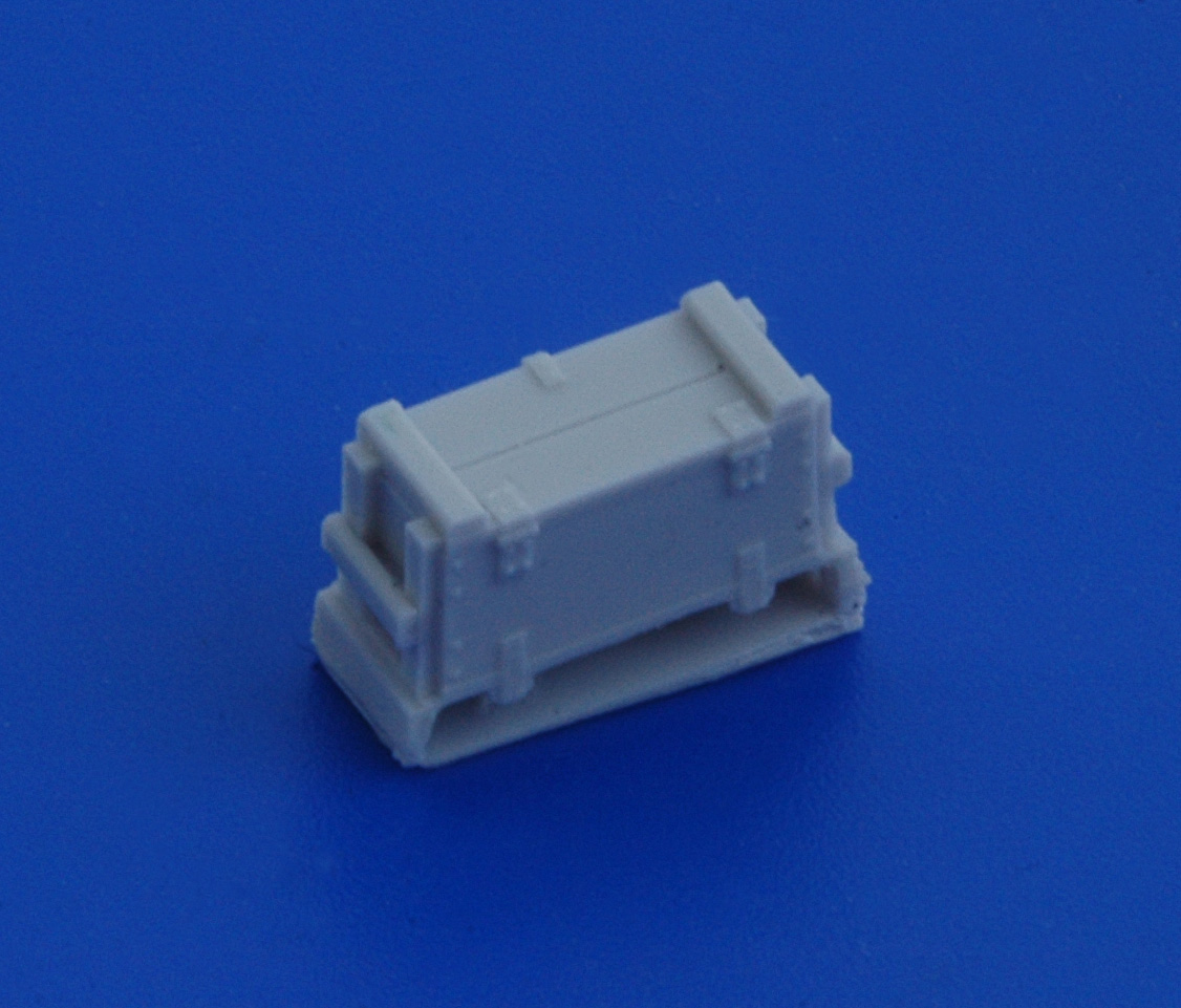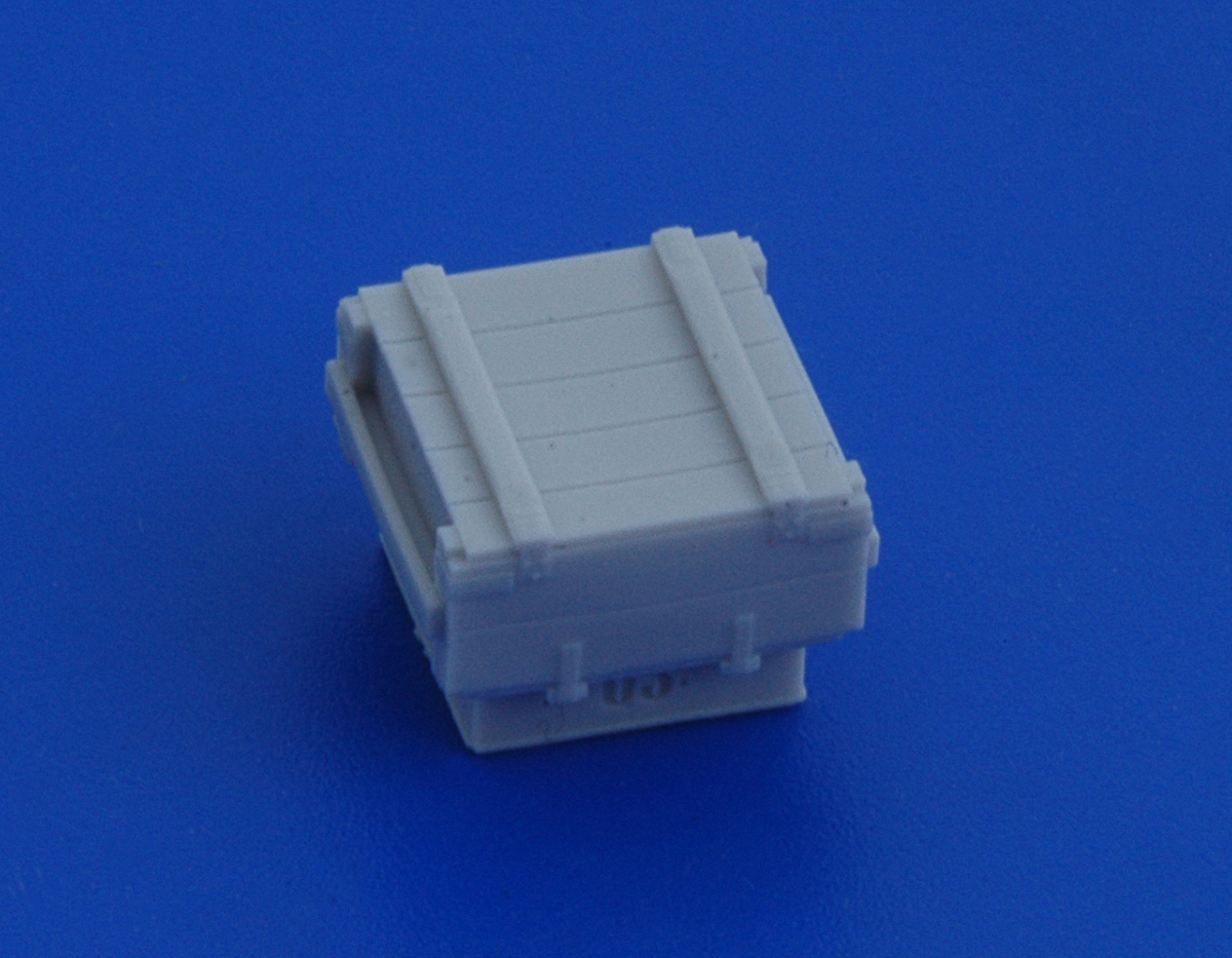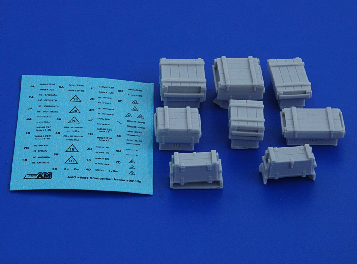 В привычной для АМ упаковке находятся инструкция. декаль и восемь отливок из серой смолы. Каждая отливка представляет собой непосредственно ящик на литнике. Всего в наборе представленно четыре вида тары, по две штуки каждого ящика.