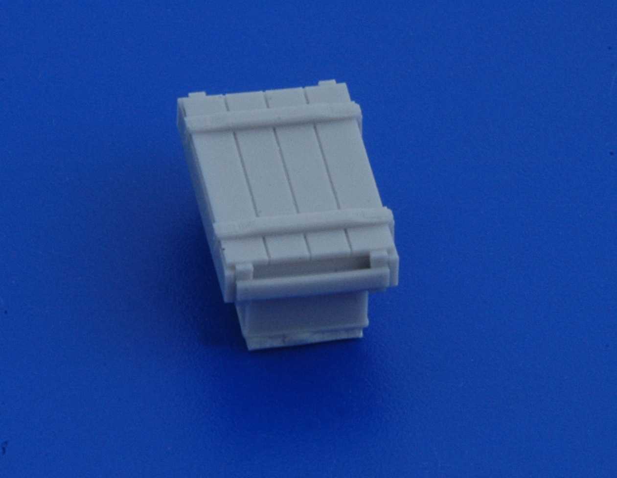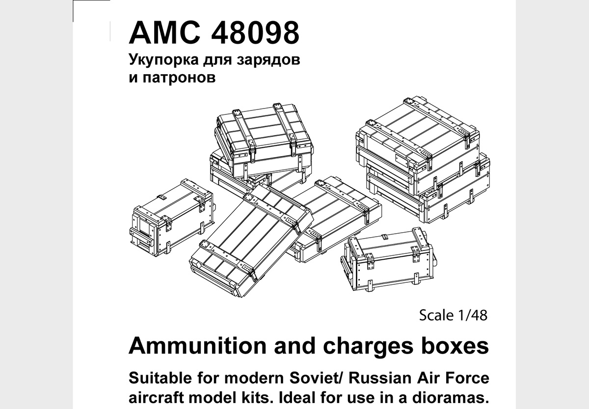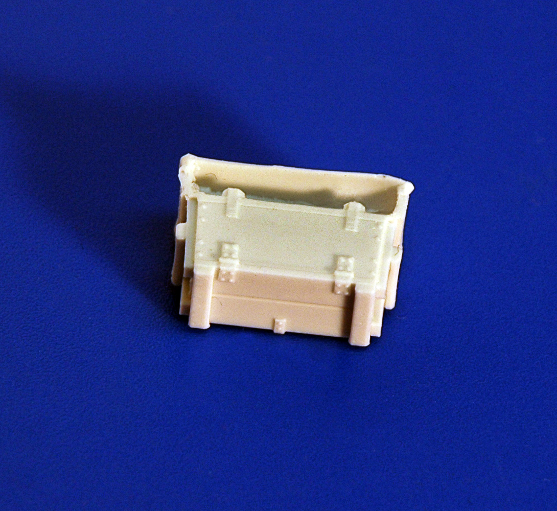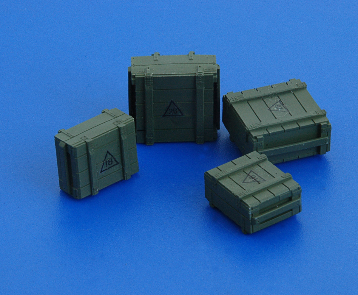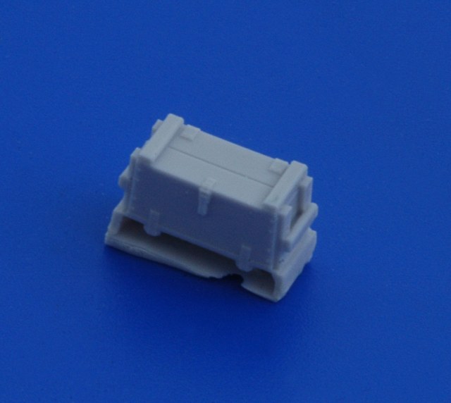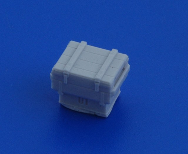 В привычной для АМ упаковке находятся инструкция. декаль и восемь отливок из серой смолы. Каждая отливка представляет собой непосредственно ящик на литнике. Всего в наборе представленно четыре вида тары, по две штуки каждого ящика.