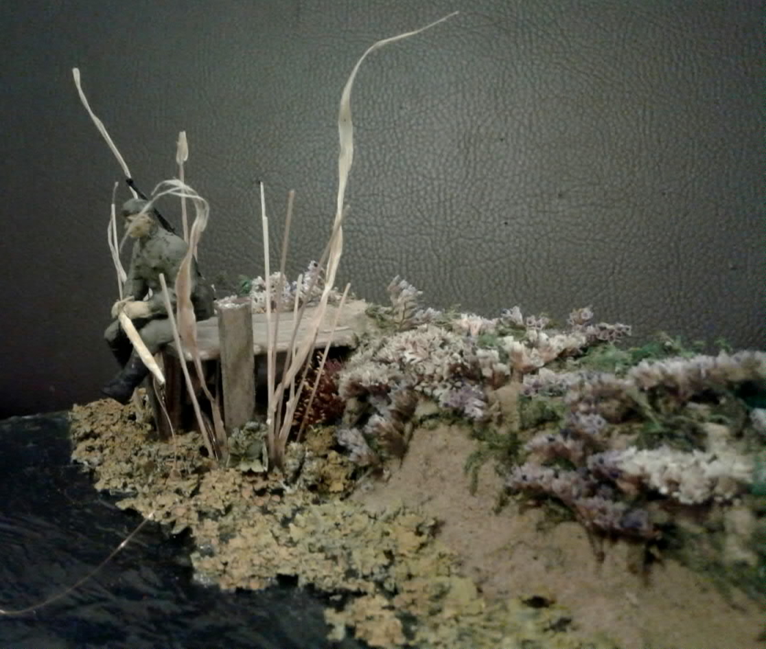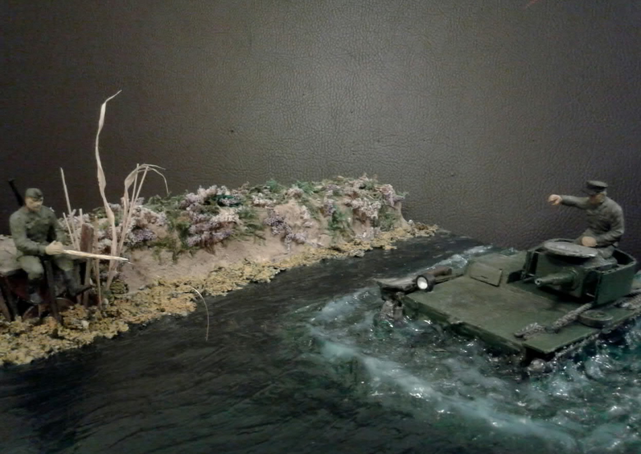 Салам Аллейкум,всмысле здравствуйте друзья.Не много юмора в ваши ленты.Решил как то солдатик порыбачить,заснул.Разбудил его уже танк :-).Материалы:цветы сухоцвет,трава мох,ряска из древесного грибка,вода-герметик VGТ(шикарная вещь:без запаха,регулируя толщину слоя меняет цвет,от прозрачного к молочному).Мостик из палочек о мороженого.Кстати танкетка то плавающая,а моделей-работ по ней чтоб в водоёме я не нашел.Странно.Всем спасибо.Советы приветсвуются