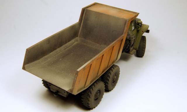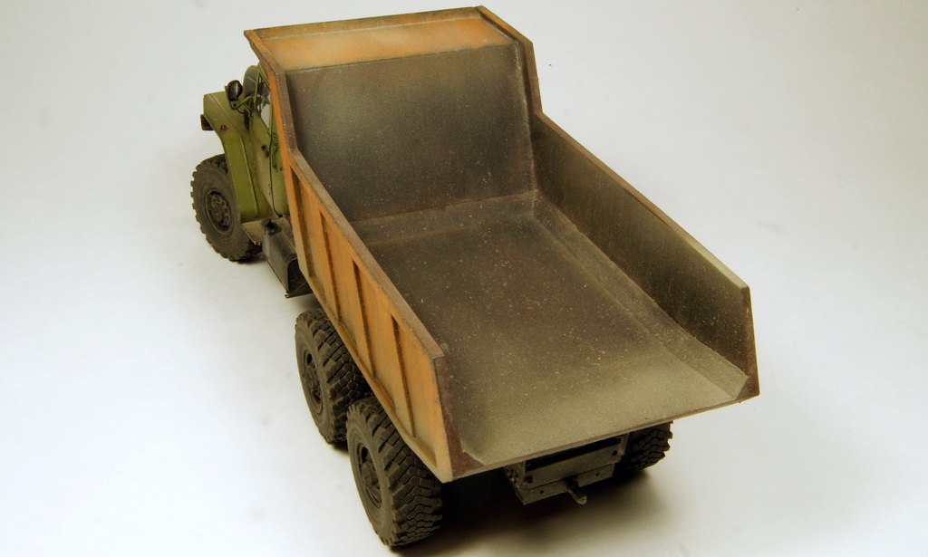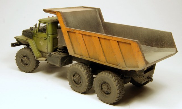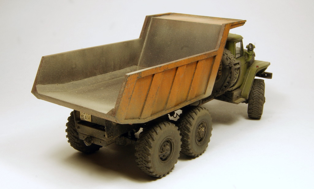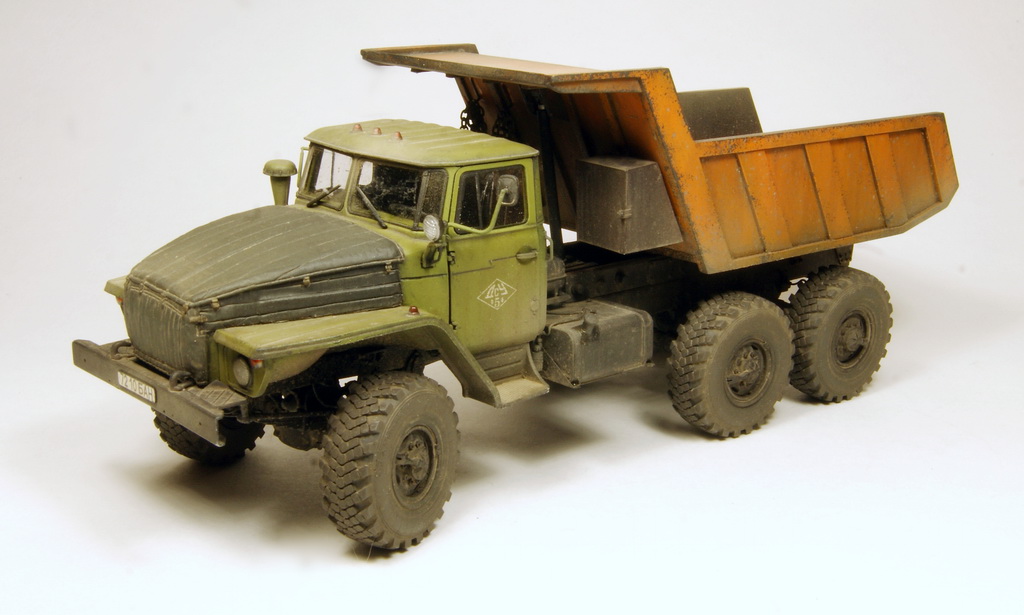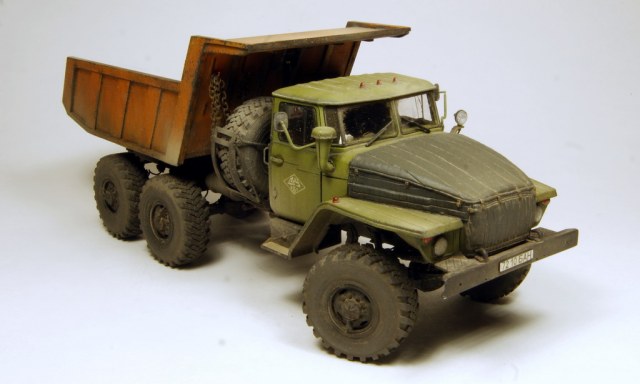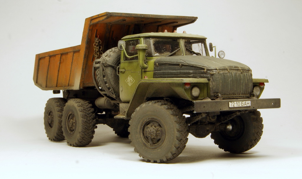 Всем известный Урал в виде самосвала. Трамповский кит дополнен конверсионным набором (совок и подрамник) от Balatonmodell, колесами от Миниарм и утеплителем от PanzerArt.