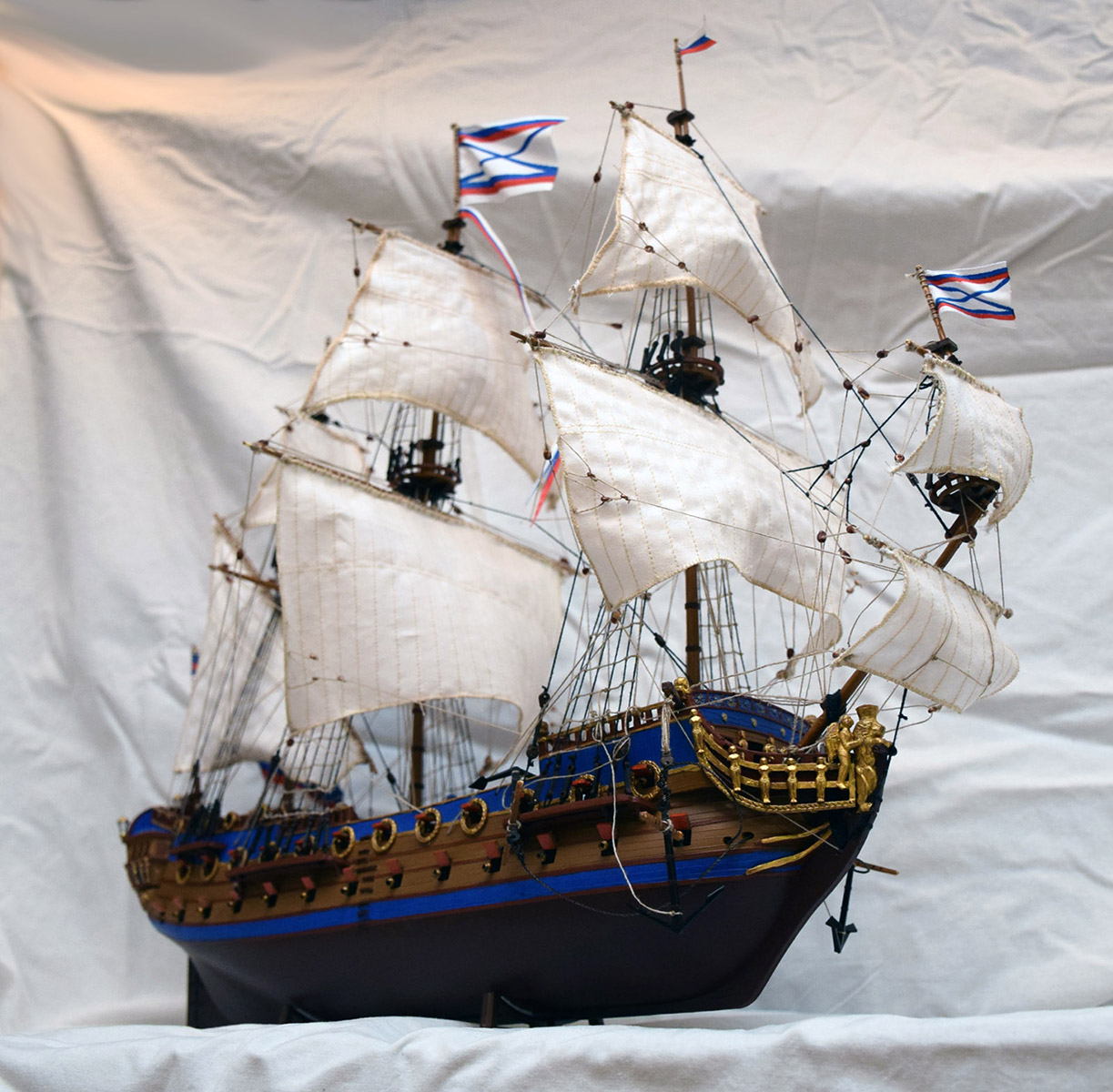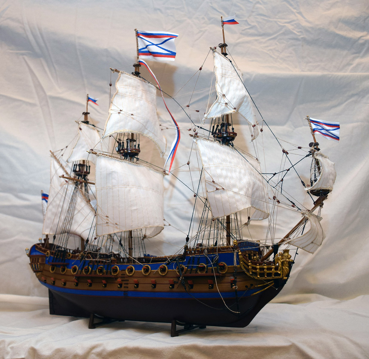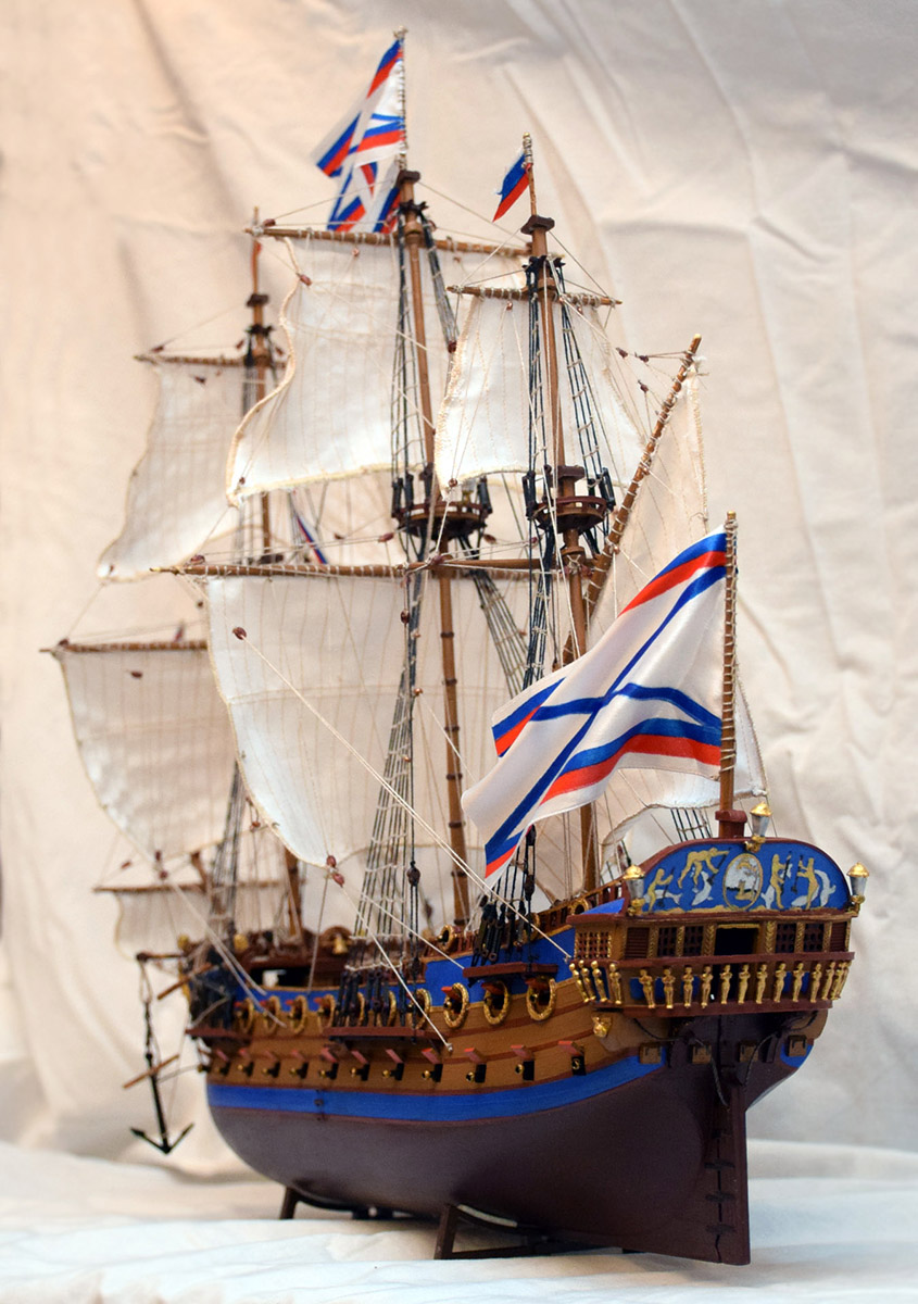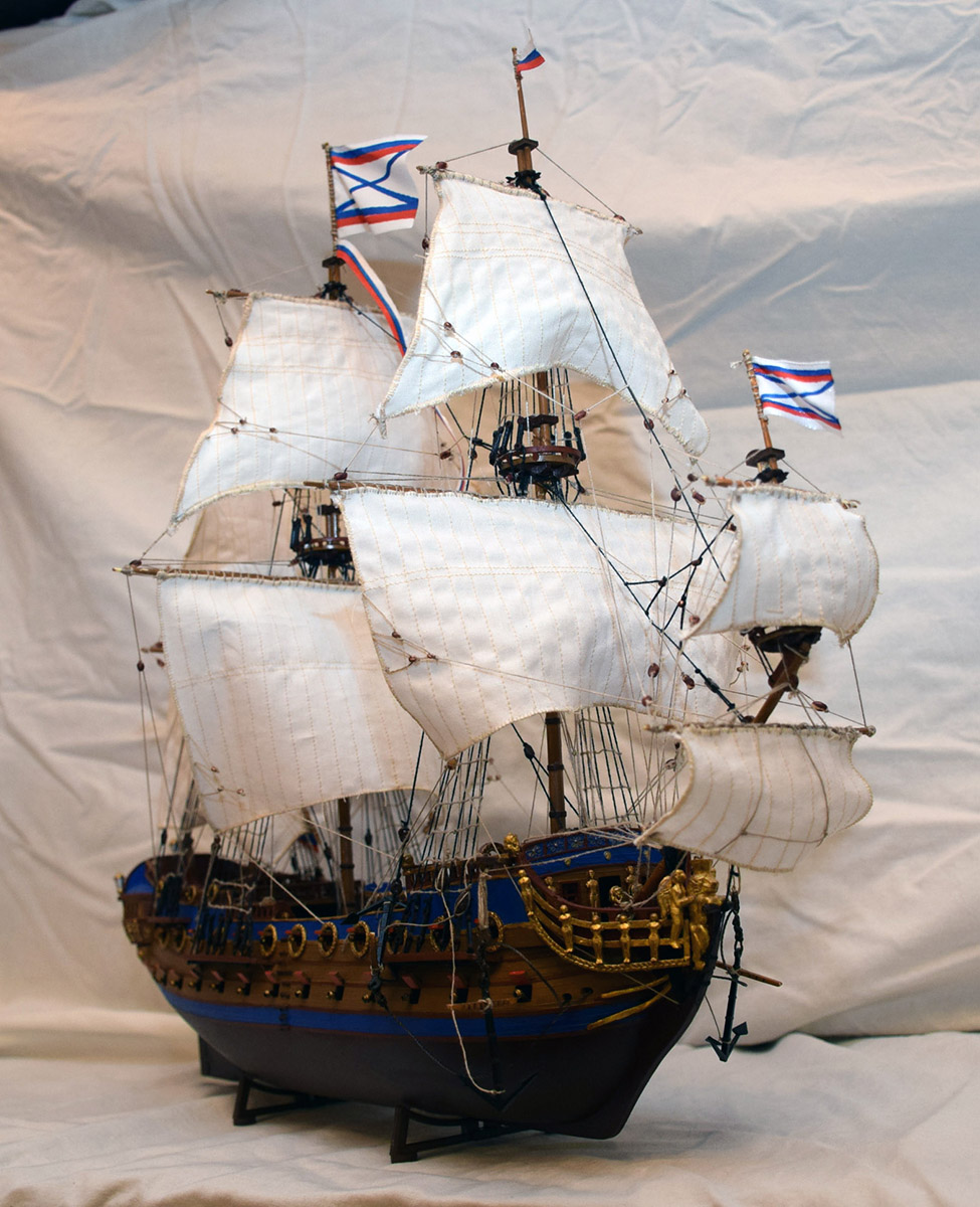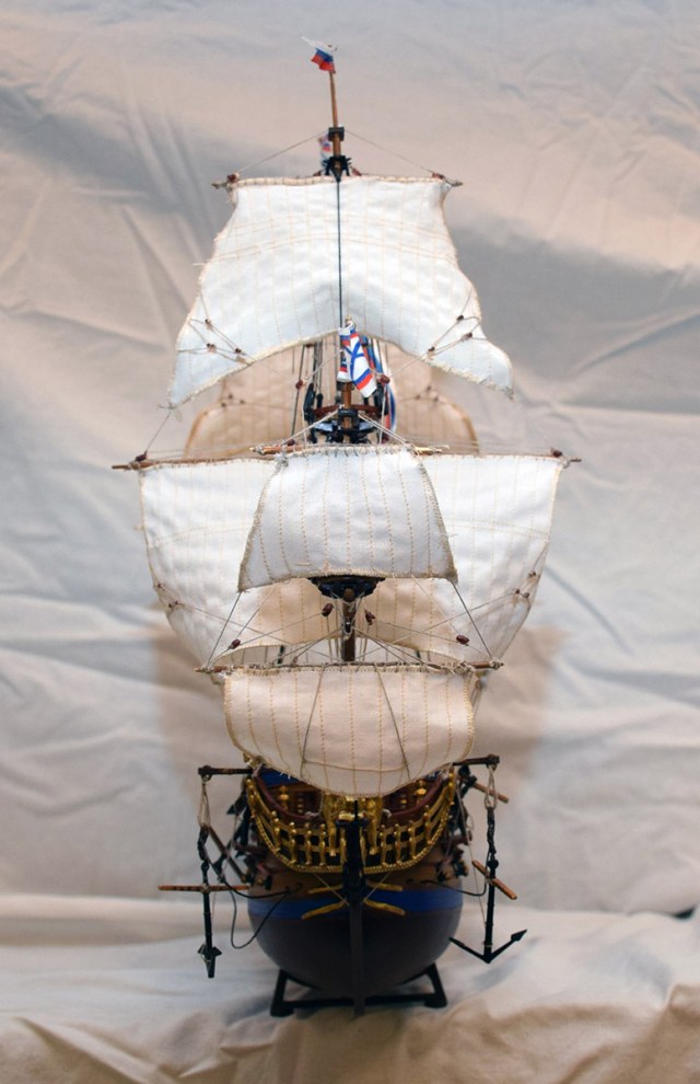 Приветствую Максим. В целом модель понравилась, вызывает больше положительных эмоций, чем отрицательных. К тому же это Арк модель, сам строил "Орла" от этого производителя, очень Вас понимаю... По недостаткам уже сказали, но хотелось бы добавить пару дружеских советов для следующих моделей: рангоут желательно весь делать из дерева, тогда и Вам будет легче работать с такелажем, и смотреться будет намного лучше; паруса больше не надо обметать (или как там правильно?) на машинке, надо к ним пришивать, или приклеивать лик-трос, так и правильней, и красивее; стоячий такелаж надо бы обтягивать посильнее (вот где пригодиться деревянный рангоут), и хоть как-то учитывать его размеры.