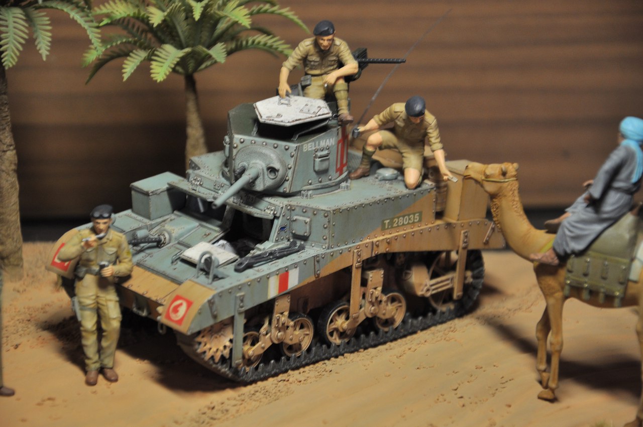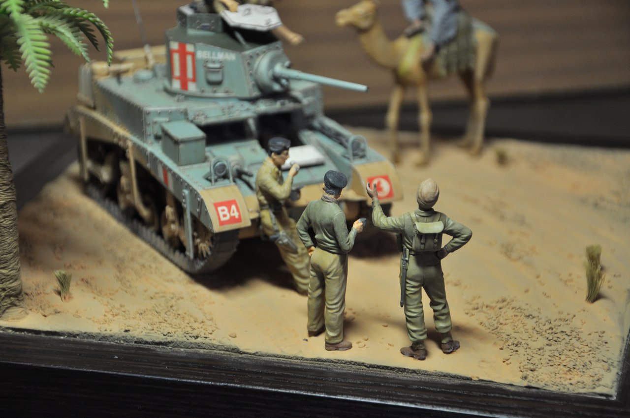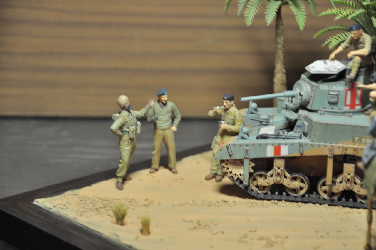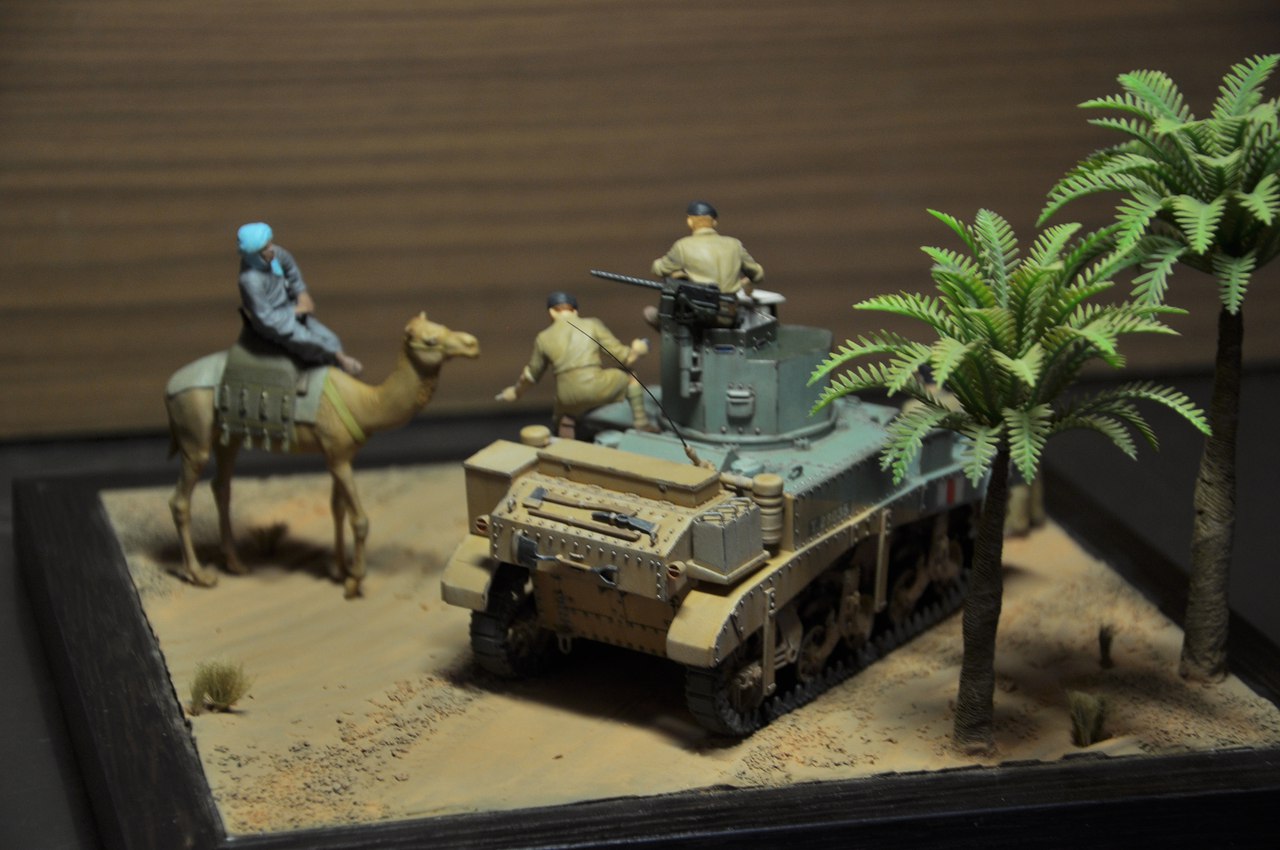 Привет коллеги по хобби и просто друзья! Получил первый, ценный опыт в постройке диорамы. Стюарт с интерьером от Academy, фигурки от MB. В фоторамку постепенно заливал слои строительной шпатлевки. После гребневидным шпателем (как для укладки плитки), сформировал форму волн-барханов. Посыпал мелким кошачим наполнителем, посадил сантехлен. Пальмы приобрел в магазине аквариумистике. Вид у них даверия не внушал. Шар из облоя вместо листьев и веток и голый тонкий пластиковый ствол. На ствол бвла намотана тонкая проволока и салфетками, смоченными в ПВА была сформирована структура ствола пальмы. Шар держал над малым огнем и постепенно связующие куски пластика и облоя оплавились. Получилась годная пальма. Далее покраска, черная акриловая база, песок напылял тамиевским акрилом xf-59 desert yellow, после пигменты. Пальма, стюарт и база фигурок красилась тоже тамиевским акрилом. Дорабатывал фигурки маслом.