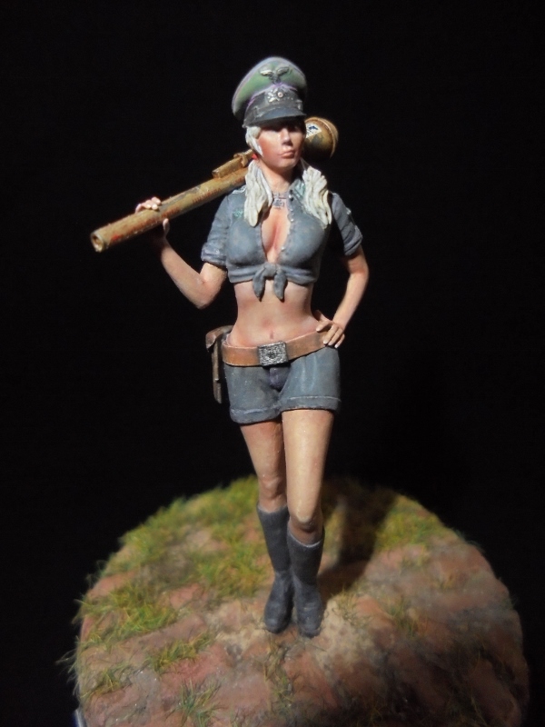 Добрый день,форумчане!Хочу вам представить свою новую работу в жанре легкого милитаристкого пин-апа-унтерефрейторша в 35-м масштабе от нашей фирмы"Армор-35"На сайте производителя фигурка заявлена в разделе фэнтези,поэтому я позволил себе некоторые вольности в росписи.Покраска была тестовой,я опять пробовал различные приемы как с фигуркой,так и с подставкой,основанием.Немного не доработал с подготовкой фигуры,на фото это вылезло,танкисткая форма тоже не получилась.Но всем желающим советую-женская скульптура превосходная,немного придется пошпаклевать и пошкурить.Краски использовал как обычно Валеджио,АК,масло"Мастер класс".Приятного всем просмотра!