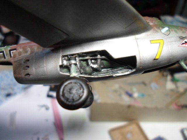В процессе доработаны ниши, улучшен кокпит (установил бронеспинку и прицел),отпилены и опущены закрылки. Стойки шасси были выполнены заранее нашим уважаемым мастером Маратом Назмеевым, за что ему огромное человеческое спасибо!!! Оставалось только их обрезать по нужному размеру. Цвета верха подбирал на глаз (RLM81а,82/83). Декаль – в основном сборная солянка, только пасть из комплекта (решил всё же в конце её прилепить, чтобы все дрожали, чтобы уважали).
