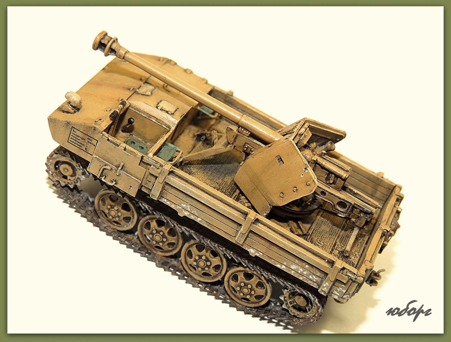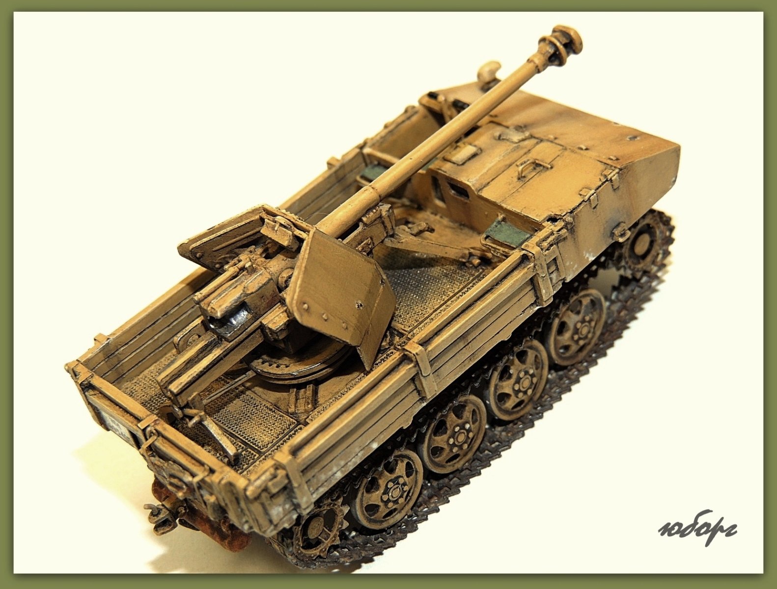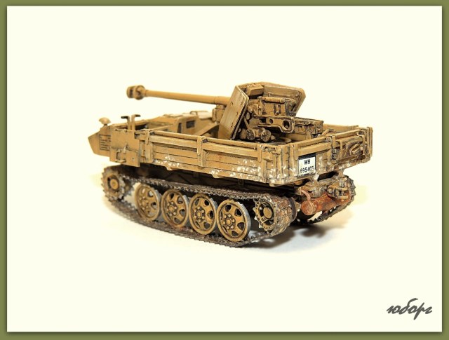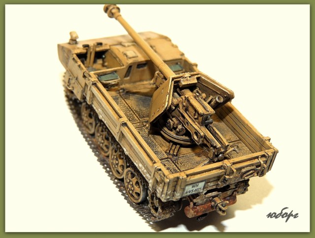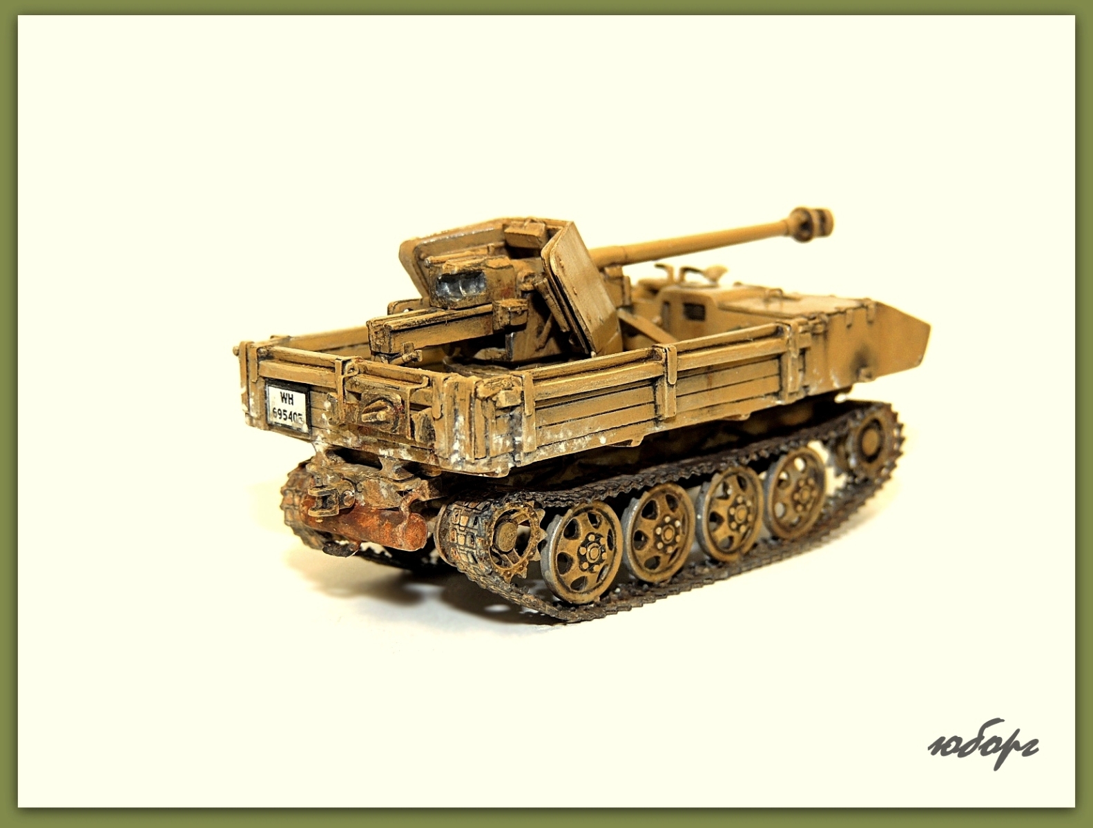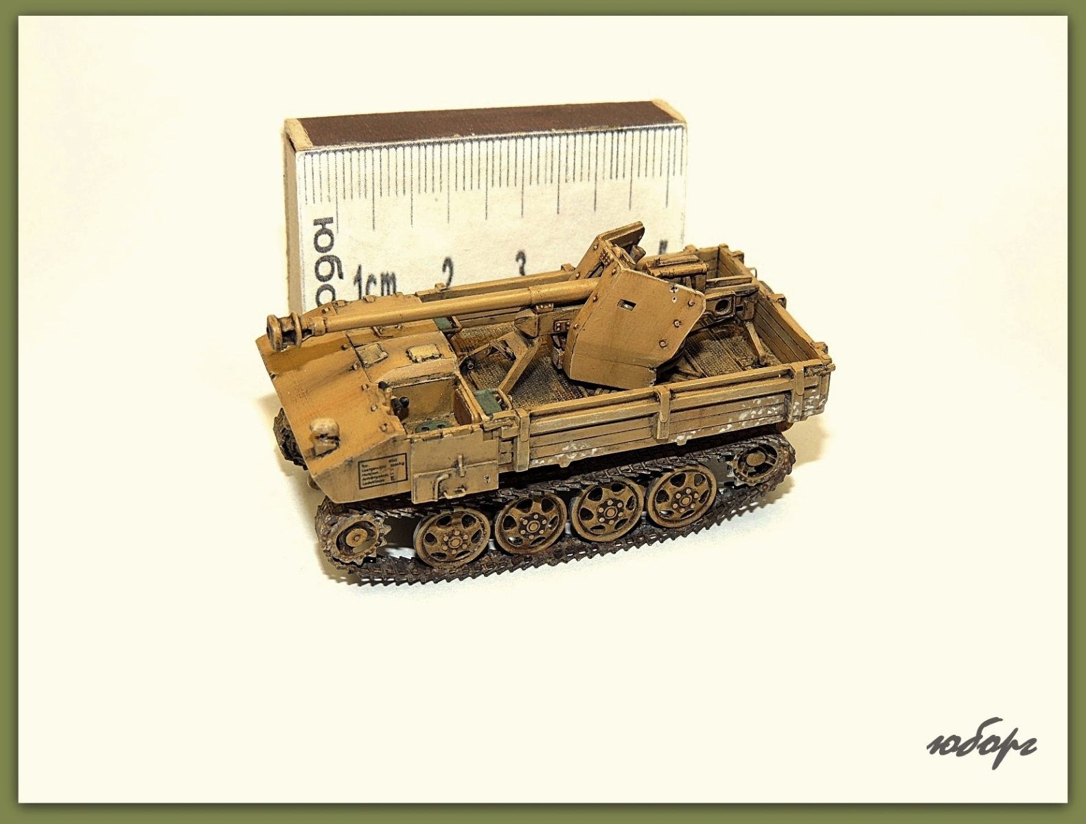 Всем здравствуйте! Выставляю редкую САУ на базе тягача RSO, от легендарной фирмы АСЕ. Что любопытно детали были неплохого качества, хотя пришлось стачивать, выравнивать и подправлять и подчас и просто вменять некоторые элементы на собственноручные(правда по мелочи). Данный образец тёмного германского гения давно будоражил моё желание его добавить в мою коллекцию(вариант с запилом был временно отложен), но появилось предложение, от которого я не мог отказаться и вот машина в сборе. Модель частая "изкаробка"! Ни чего сверх выдумывать не стал, дабы не затягивать и что самое главное не испортить, хотя конечно натяжной тент с рамой сделать бы не помешало. Из того что сделал, это стачивал, стачивал всё по толщине(откидные крышки рубки, борта кузова, орудийные щиты, станки крепления орудия, звёздочки по ширине и пр.). Гусеницы травлёные, впервые с ними сталкиваюсь, пришлось помучится что бы не испортить. Кое что рассказано в сказке, вот тут: http://karopka.ru/forum/messages/forum261/topic24712/message1101741/#message1101741
